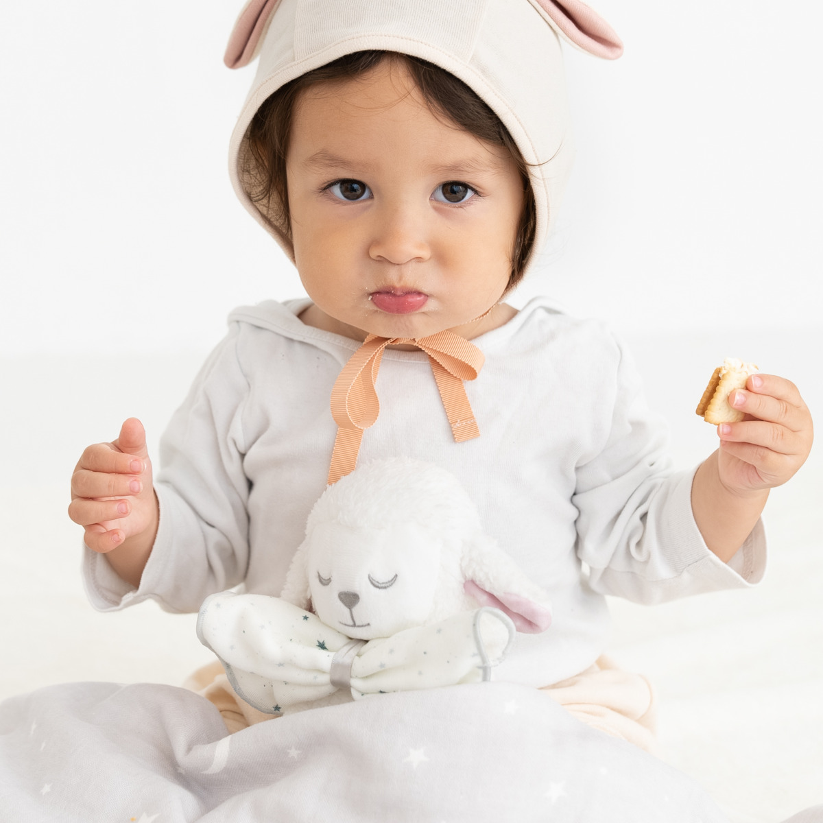 食品衛生検査をクリアしたボア素材は、ベビーが口に含んでも安全です。パーツを縫い付けていないので、もしもの時に外れて、お子さんが誤飲してしまうこともありません。お外に連れて行って汚れてしまっても手洗いできるのでいつも清潔にお使いいただけます。