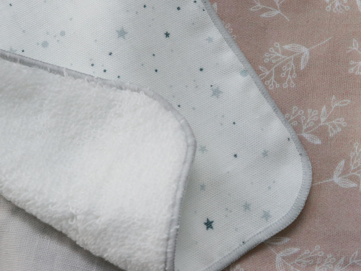 リボンをほどくと15cm×15cmサイズのミニハンカチに早変わり。表面は抗菌効果のあるコットン製、裏面はオーガニックパイル製です。