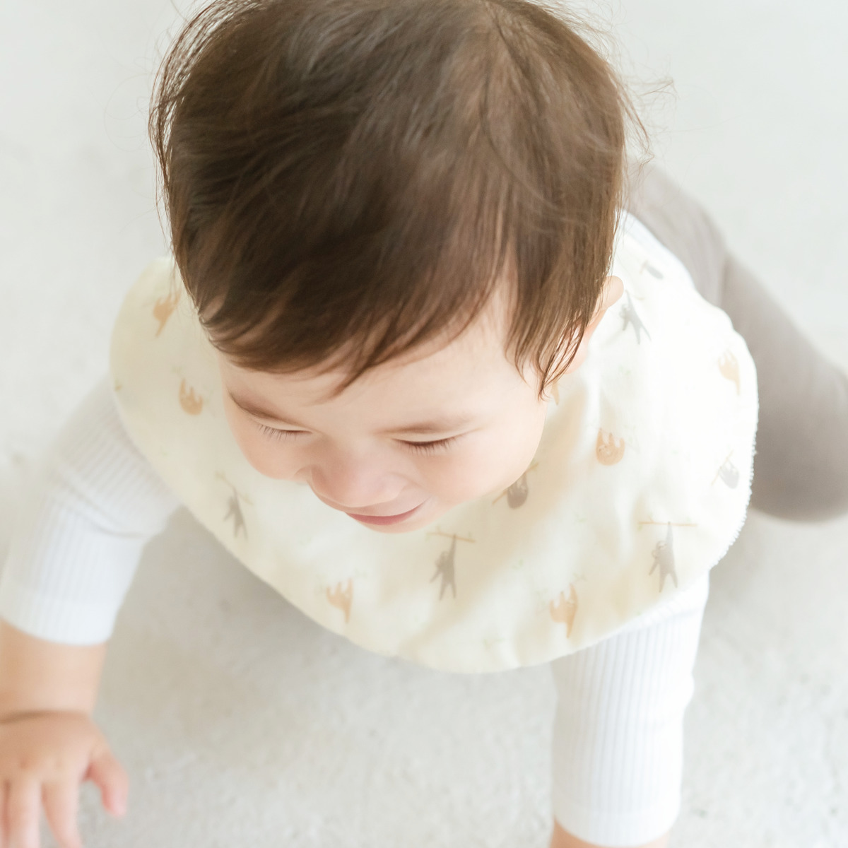 吸水性のよいダブルガーゼでよだれや食べこぼしもしっかりキャッチします。柔らかいガーゼなので赤ちゃんの肌を傷つけません。裏面にも吸水性のよいコットン100%のパイル生地を採用しています。