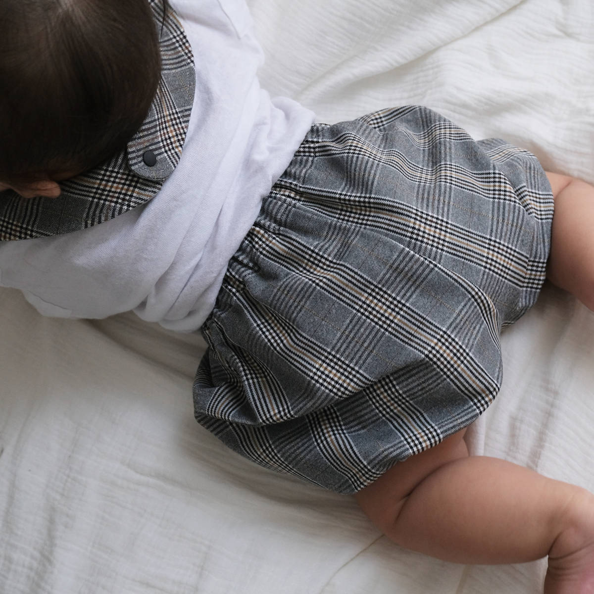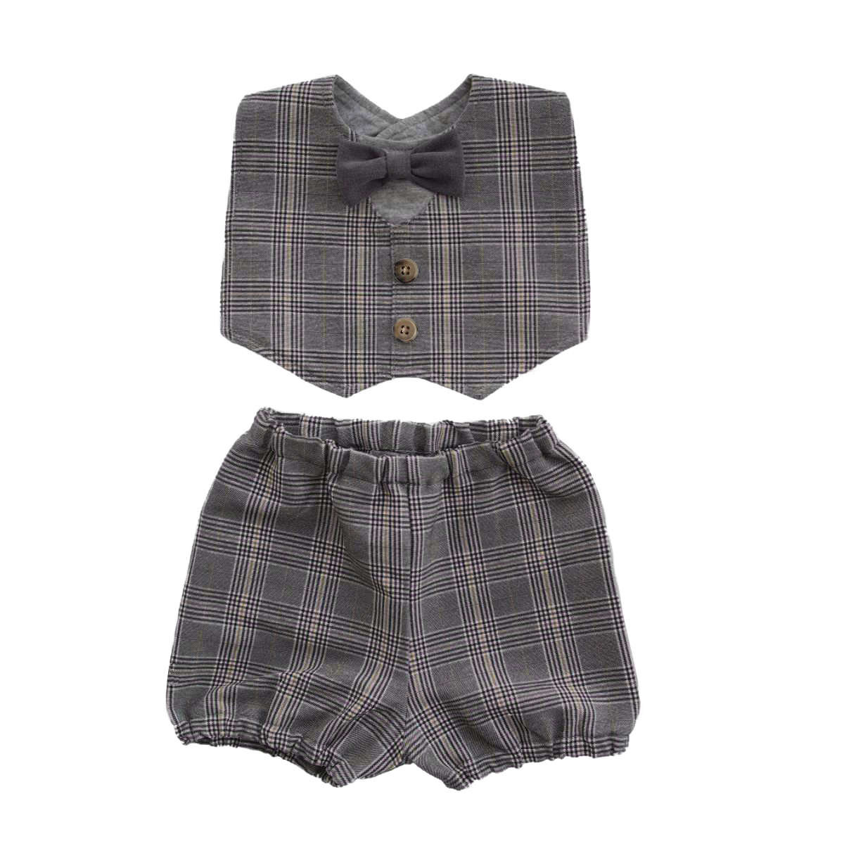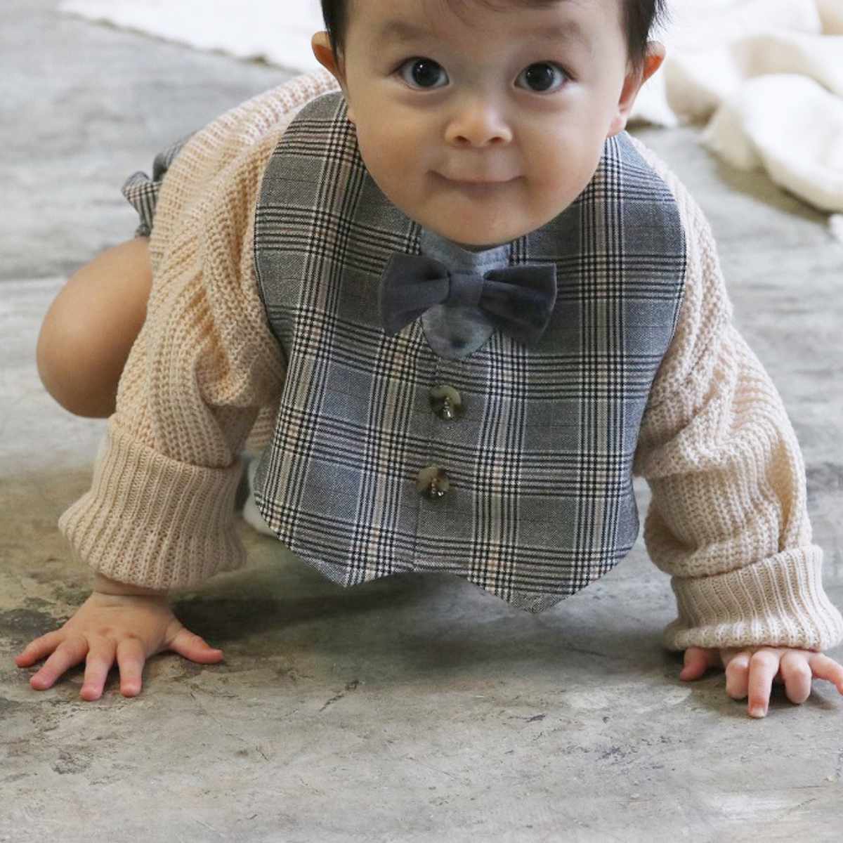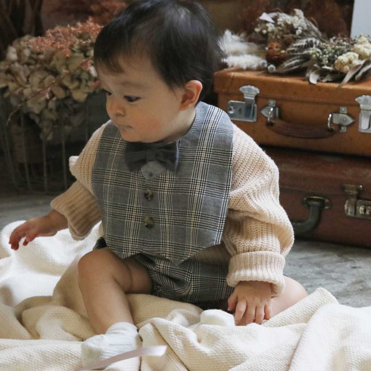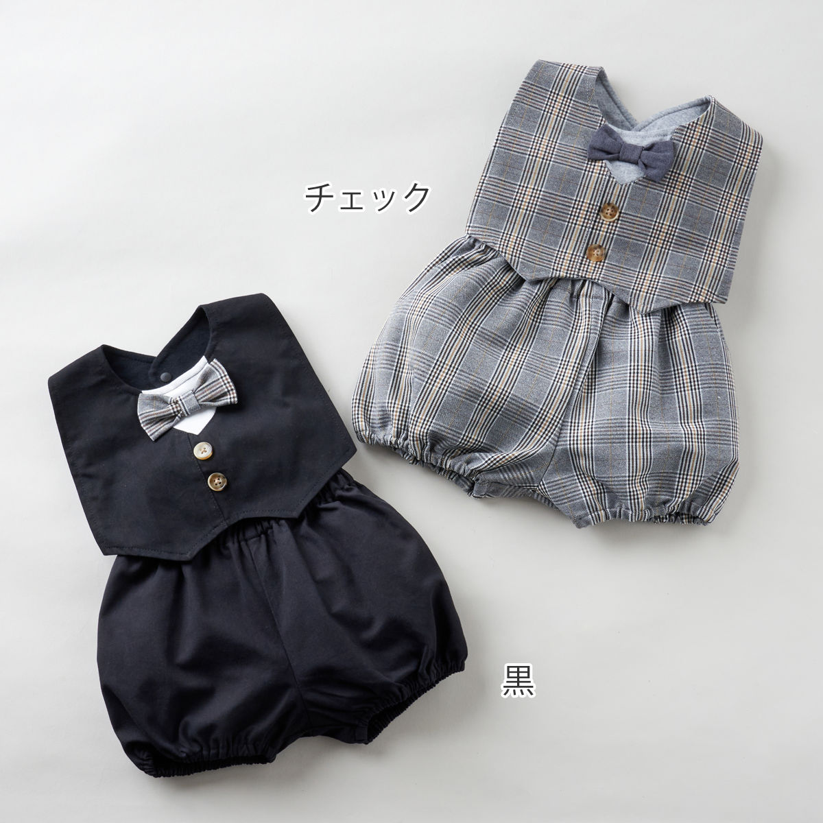 まるでスーツを着てるようなベスト風デザインのスタイとブルマのセットです。生後半年くらいから、1歳ごろまで長く着用いただけます。