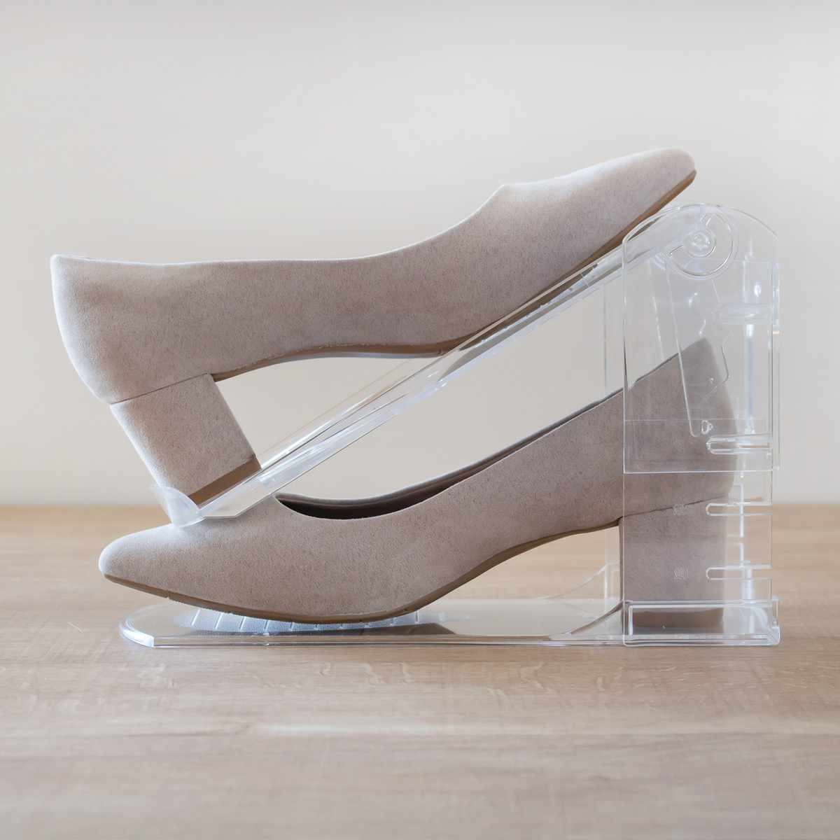 高さは3段階に調節可能で、ローヒールやスニーカー、ハイヒールなど、高さの異なる靴にも対応します。上段を持ち上げて、突起を下段の溝に差し込むだけで、お好みの高さに調節できます。