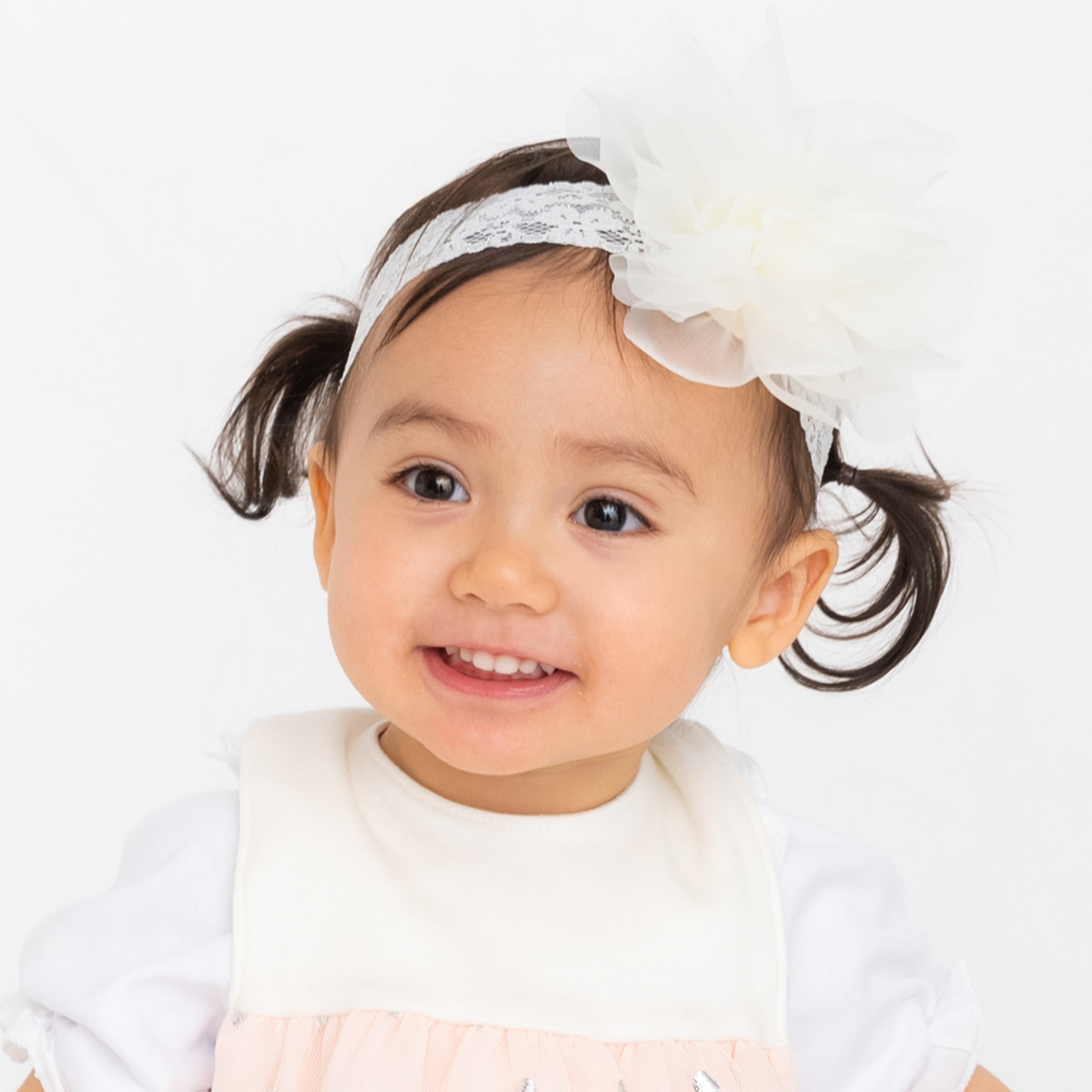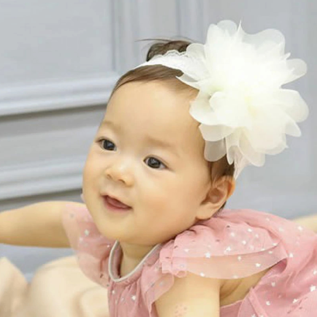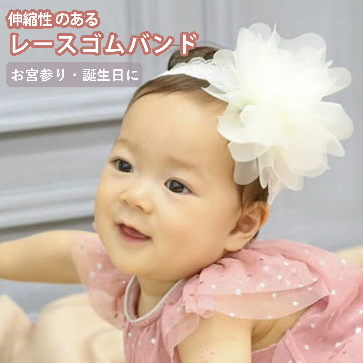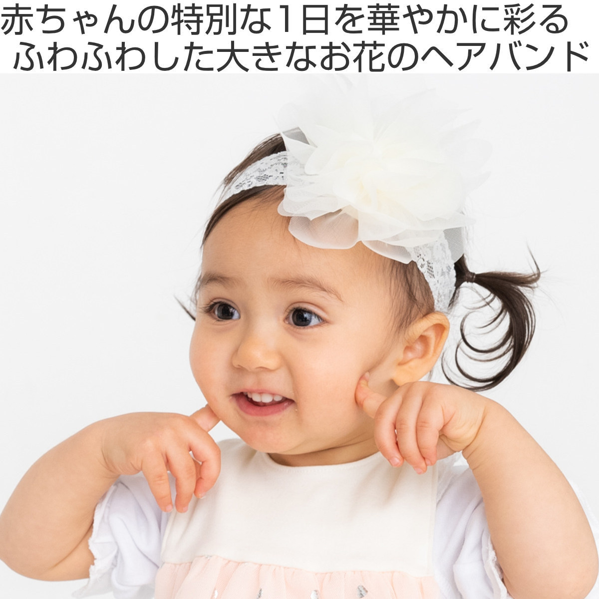ボリュームたっぷりな存在感抜群のヘアバンドです。赤ちゃんのお誕生日や記念撮影などの特別な日の装いを華やかに彩ります。