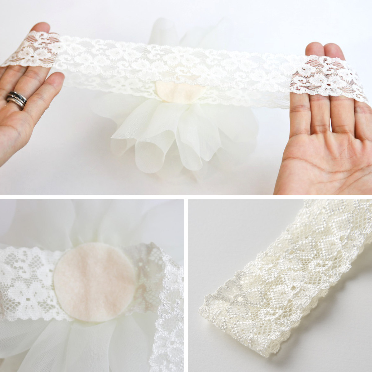 良く伸びるレースゴムで仕上げています。赤ちゃんの頭を締め付けない柔らかい素材です。身に着ける赤ちゃんにストレスを与えないようにと、ママデザイナーたちが話し合いを重ねて作り上げました。
