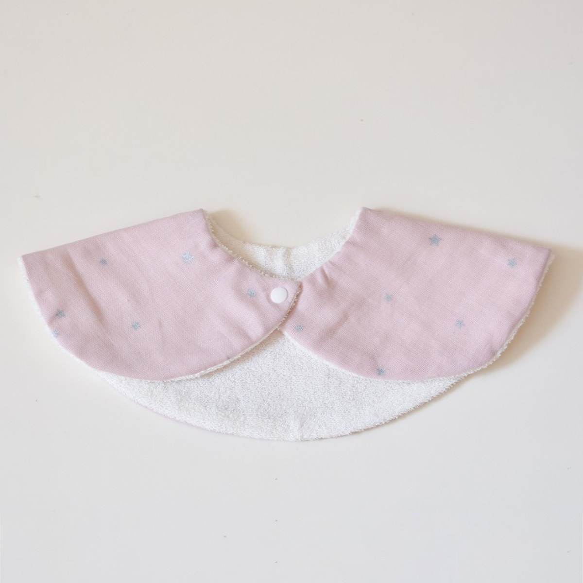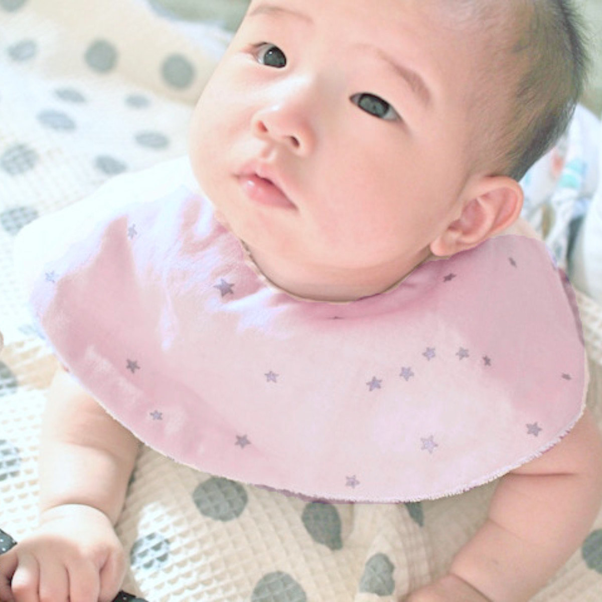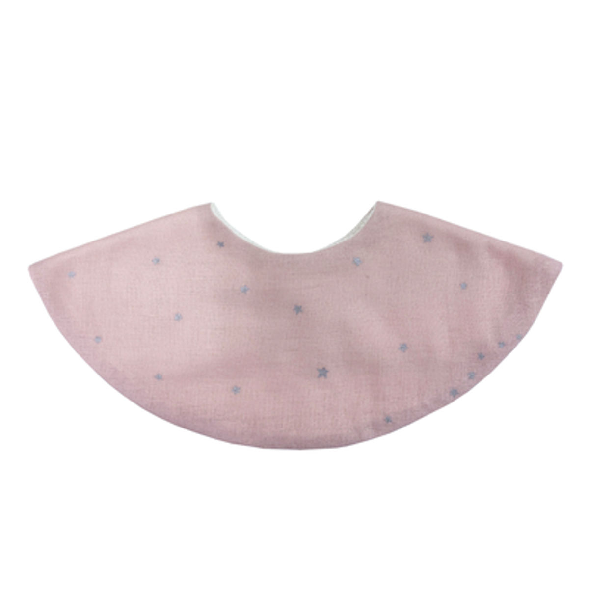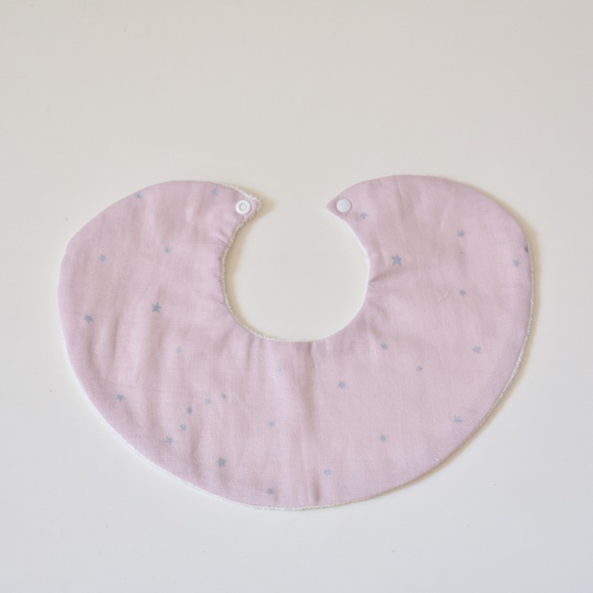 丸い形の星柄のスタイです。前も後ろも丸い形で守られているので、赤ちゃんが動いても服が汚れにくいです。