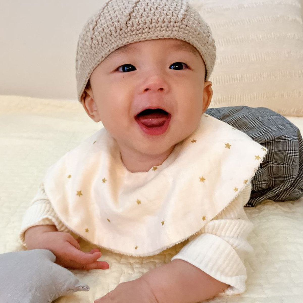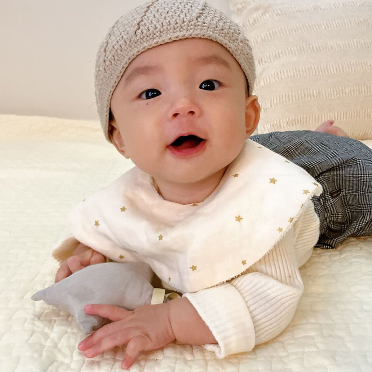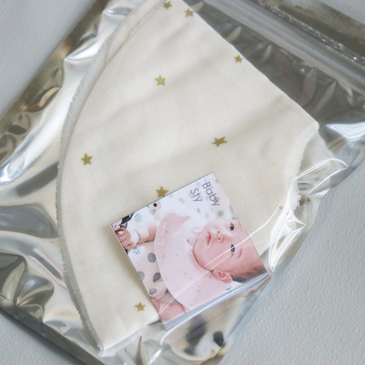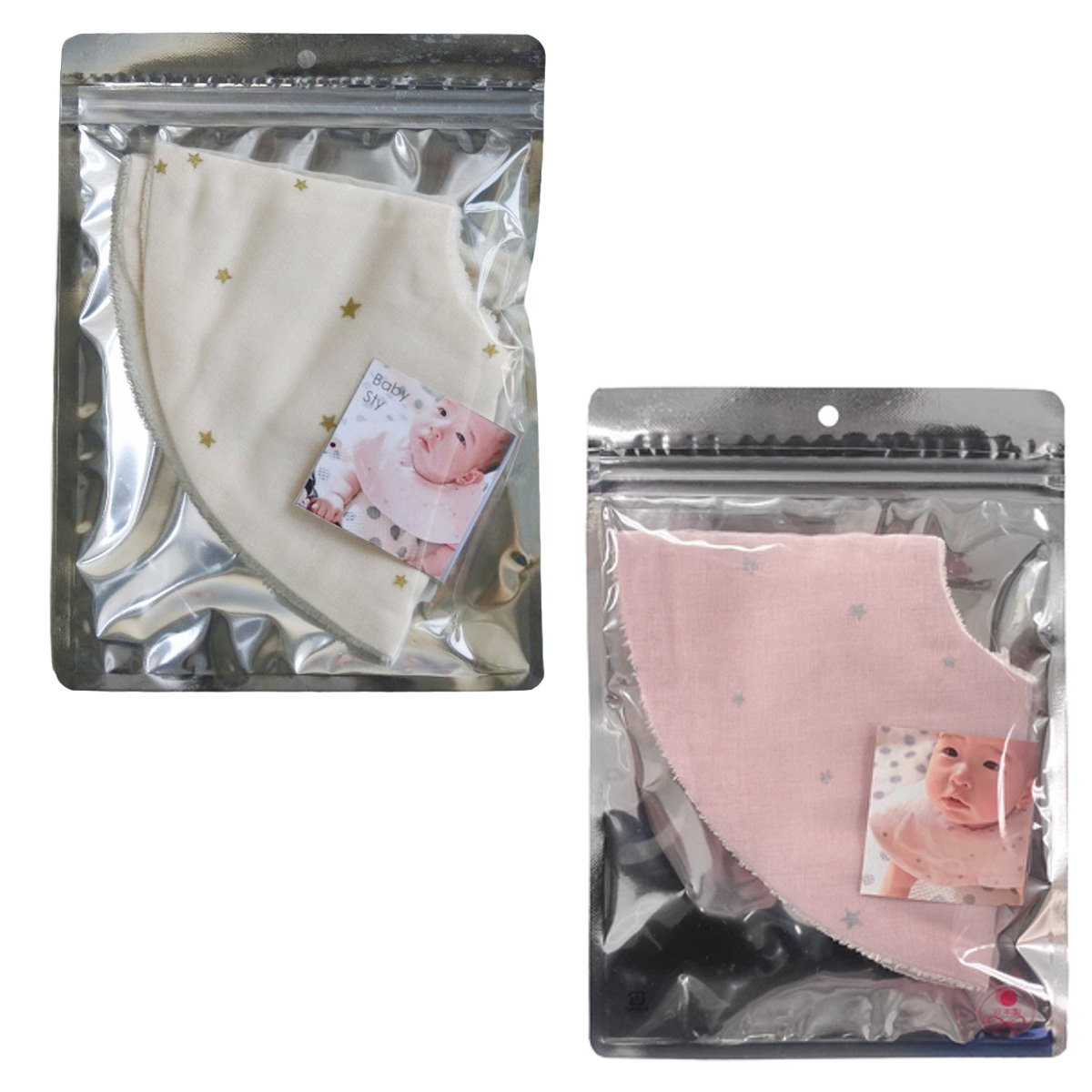 丸い形の星柄のスタイです。前も後ろも丸い形で守られているので、赤ちゃんが動いても服が汚れにくいです。