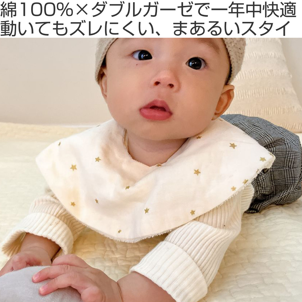 ふんわり柔らかいガーゼを贅沢に2枚重ねた、ダブルガーゼ仕様のスタイです。2枚重なっていることで丁度良い通気性を保ち、早く水分を放出するため、夏も冬も快適な素材です。