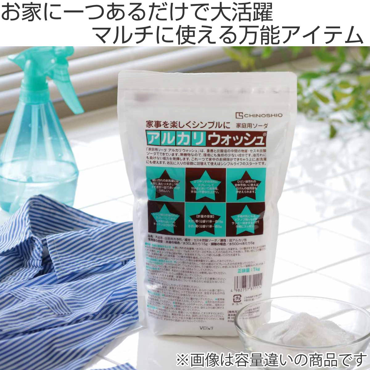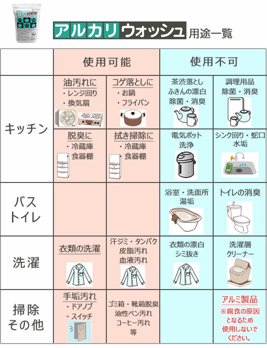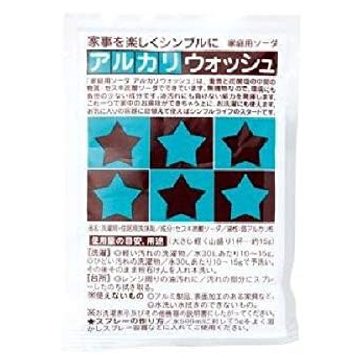 家中のお掃除・お洗濯に、多用途に使える洗浄剤です。重曹に比べてアルカリ性が強く、油汚れや皮脂汚れがよく落ちます。発泡剤などを含まず、泡がたたないのですすぎもラクラクです。
