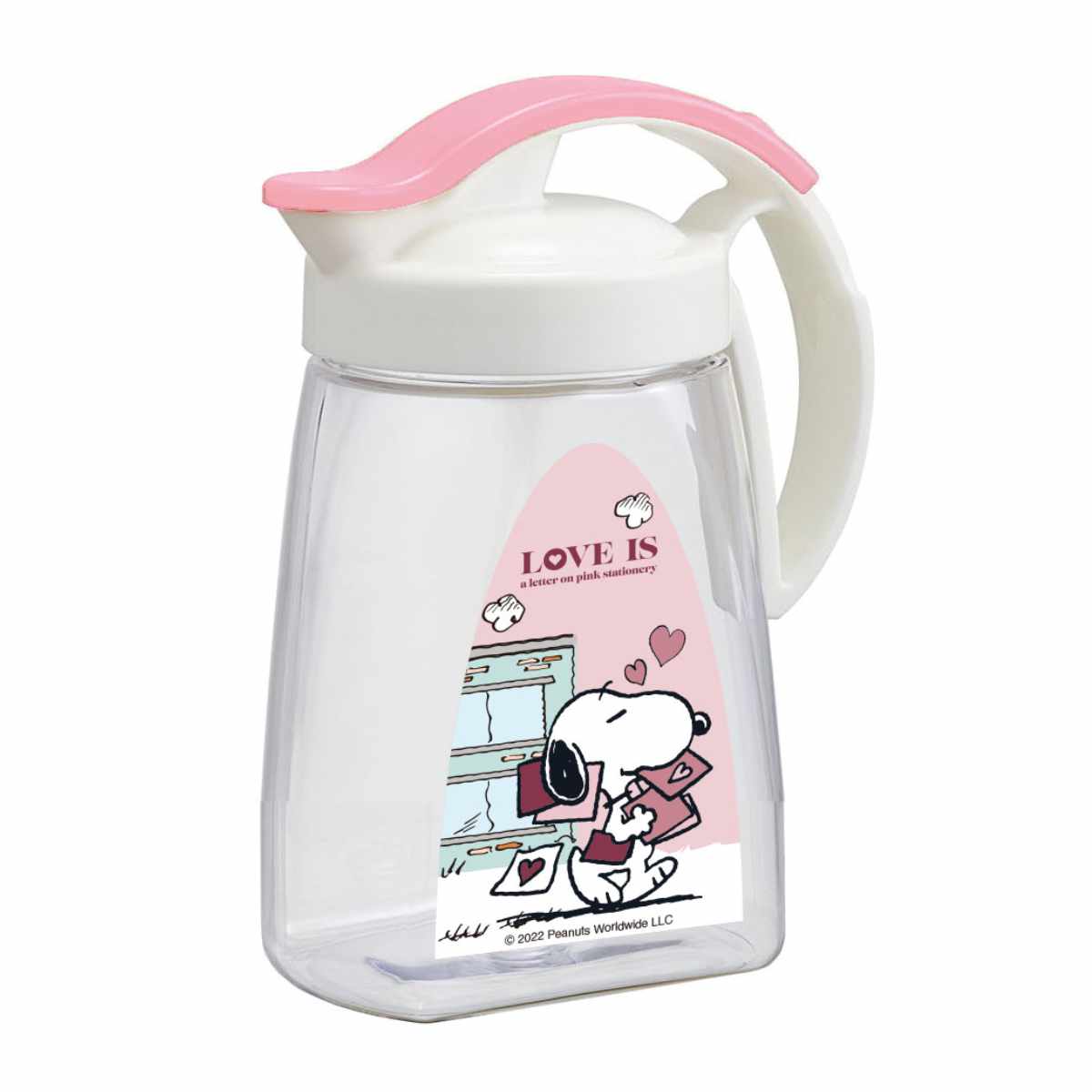 ハートのお手紙を持ったスヌーピーのイラストが可愛いピッチャーです。密閉性が高いので縦向きはもちろん、横向きにも収納できます。小さめの冷蔵庫やドアポケットが狭い冷蔵庫でも収納しやすく、空いたスペースを有効に活用できて便利です。また、片手で開閉できるのも嬉しいポイントです。