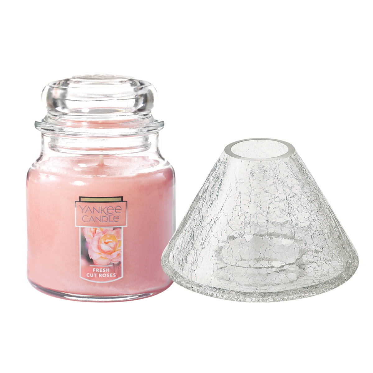 ヤンキーキャンドルのジャーM、L専用のシェード付きです。表面に施したクラック(ひび)加工が特徴で、いつもの灯りとは違うアンティークな雰囲気を楽しんでいただけます。シェードをつけることで炎の熱が逃げにくくなり、キャンドルが溶けやすくなるので、香り立ちが良くなるうえに、中心だけが溶けていくトンネル現象を防ぐことができます。消火の際は、吹き消さないでジャーのフタを閉めると煙やニオイが外にたたずに消せます。