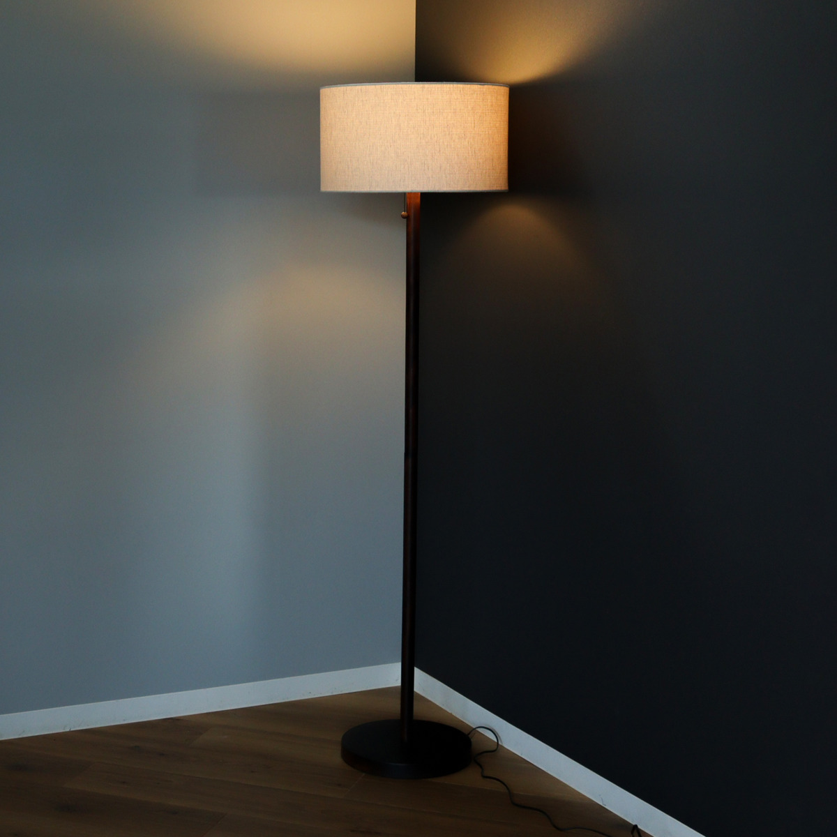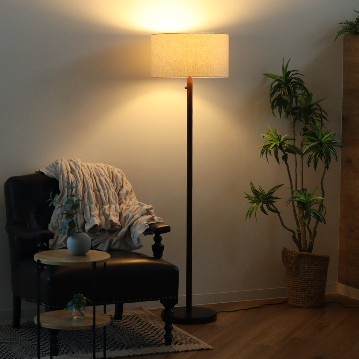 木製ベースの重厚感が、お部屋をお洒落な空間にしてくれるフロアライトです。シックで落ち着きのあるダークブラウンのスタンドとシンプルなシェードがお部屋に馴染みやすく、間接照明としてインテリアに取り入れやすいです。和モダンや北欧テイストなど、様々なテイストのお部屋でお使いいただけます。