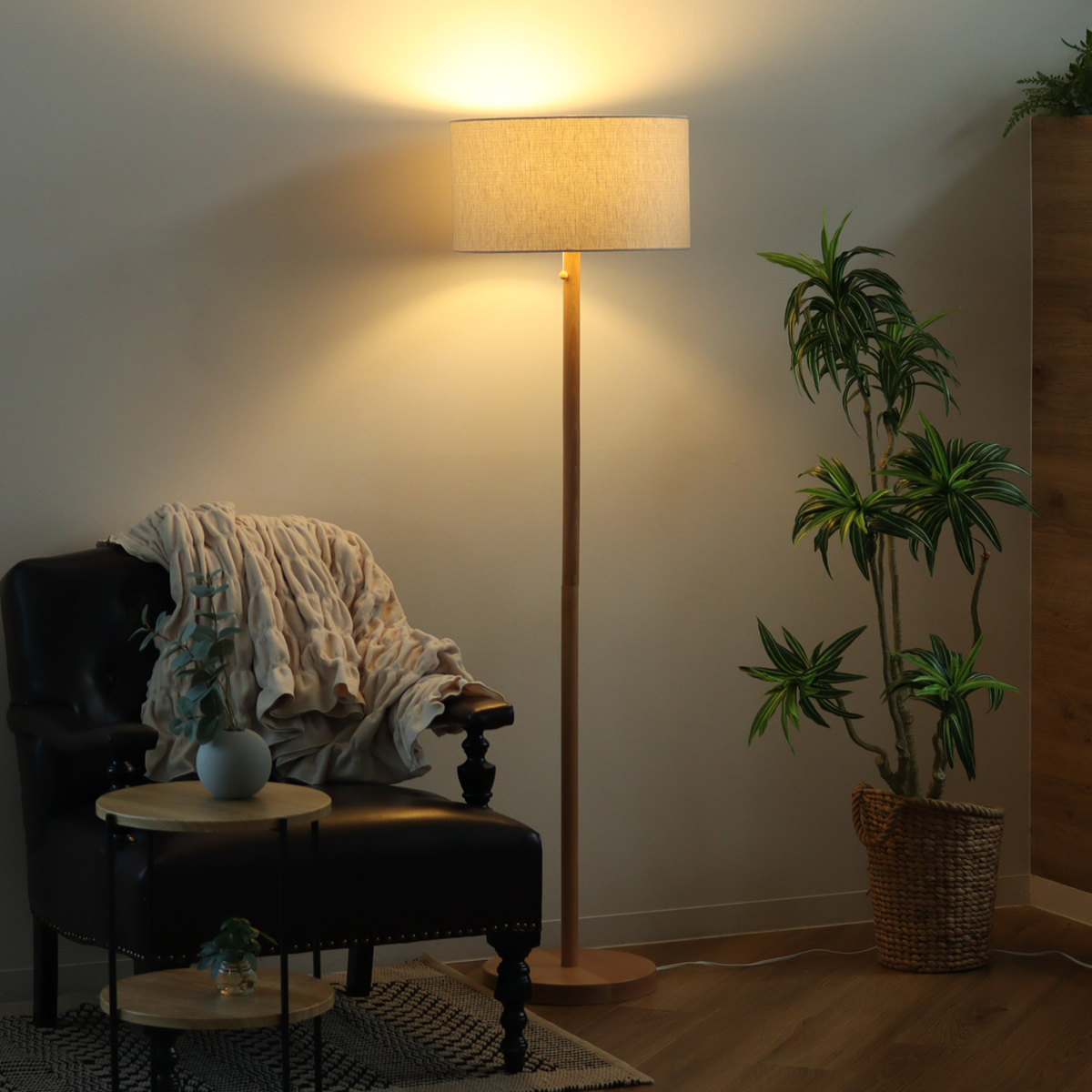 木製ベースの重厚感がお部屋をお洒落な空間にしてくれるフロアライトです。木目を活かしたナチュラルなスタンドとシンプルなシェードがお部屋に馴染みやすく、間接照明としてインテリアに取り入れやすいです。和モダンや北欧テイストなど、様々なテイストのお部屋でお使いいただけます。
