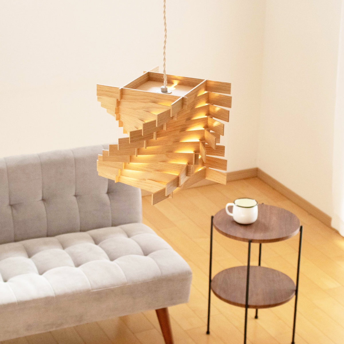 点灯していない時でも、立体的なトルネードフォルムが際立ち、まるでアートオブジェのような存在感を放ちます。昼間の自然光の下でも木の美しい造形や素材感が楽しめ、インテリアのアクセントとして空間を印象的に演出します。