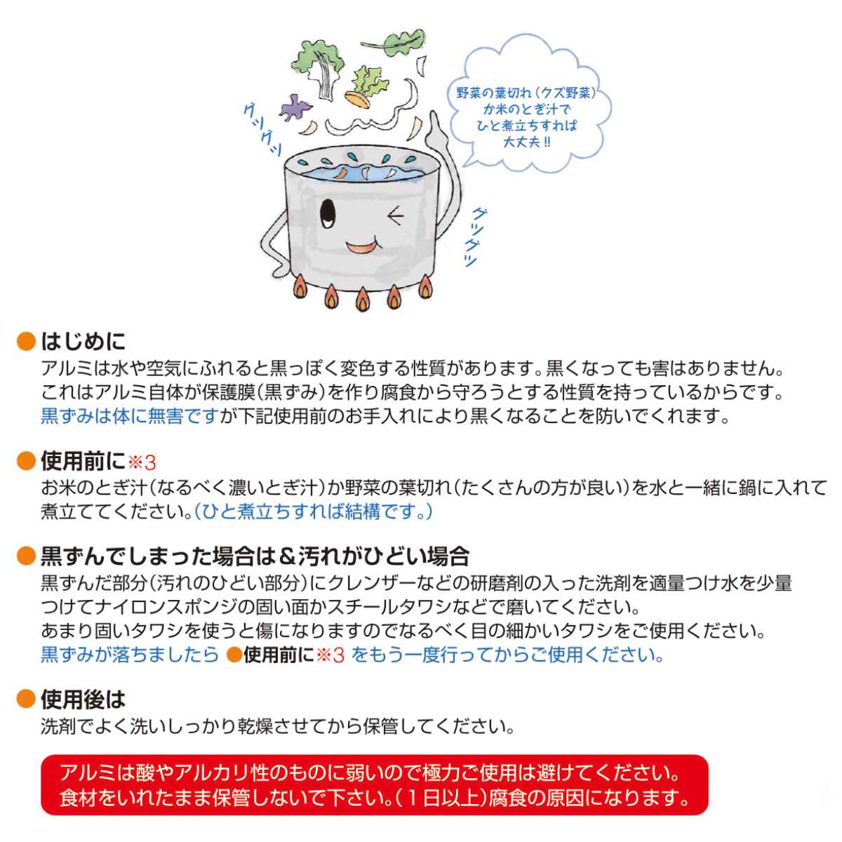 ・ご使用前に:お米のとぎ汁か野菜の葉切れを水と一緒に入れて煮立ててください。