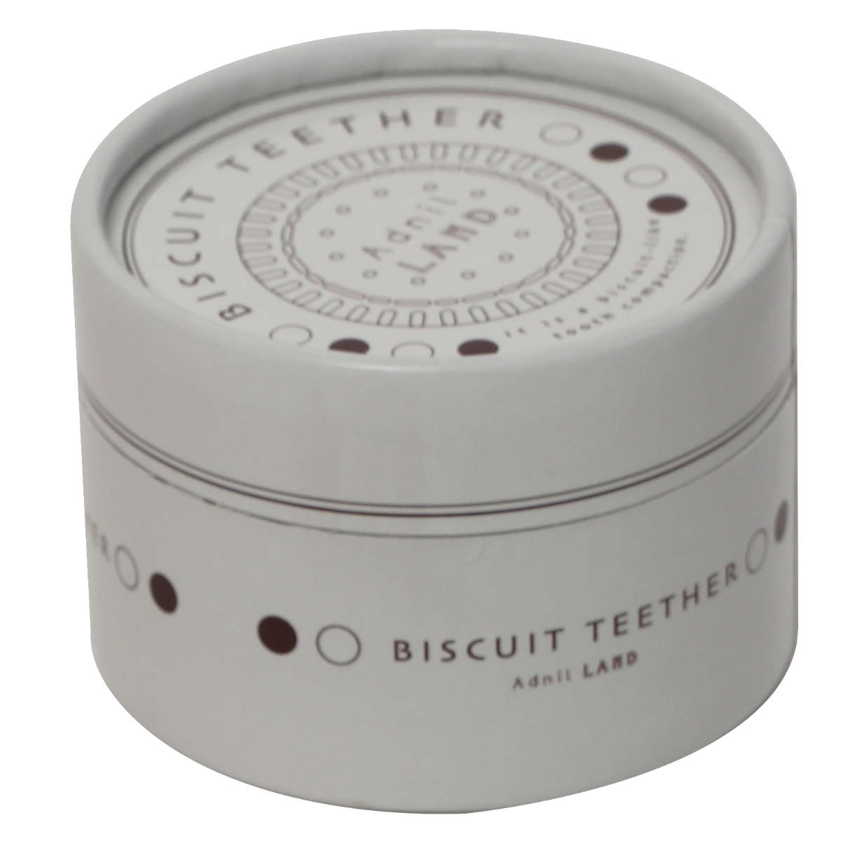 本当にビスケットを食べているようにみえる可愛らしいデザインの歯固めです。なめたり、噛んだりして歯ぐきのムズムズを解消します。丸いビーズが連なったストラップは振ったり、掴んだりして脳に刺激を与え形状を認知するのに役立ちます。スタイリッシュな丸いケースに入っているので、ちょっとした贈り物にも最適です。