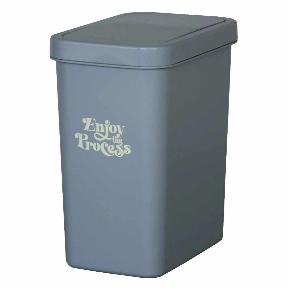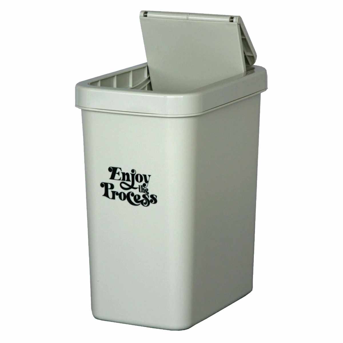 英字ロゴがアクセントのスタイリッシュなゴミ箱です。表面はマットな質感で主張しすぎず、落ち着いた雰囲気です。
