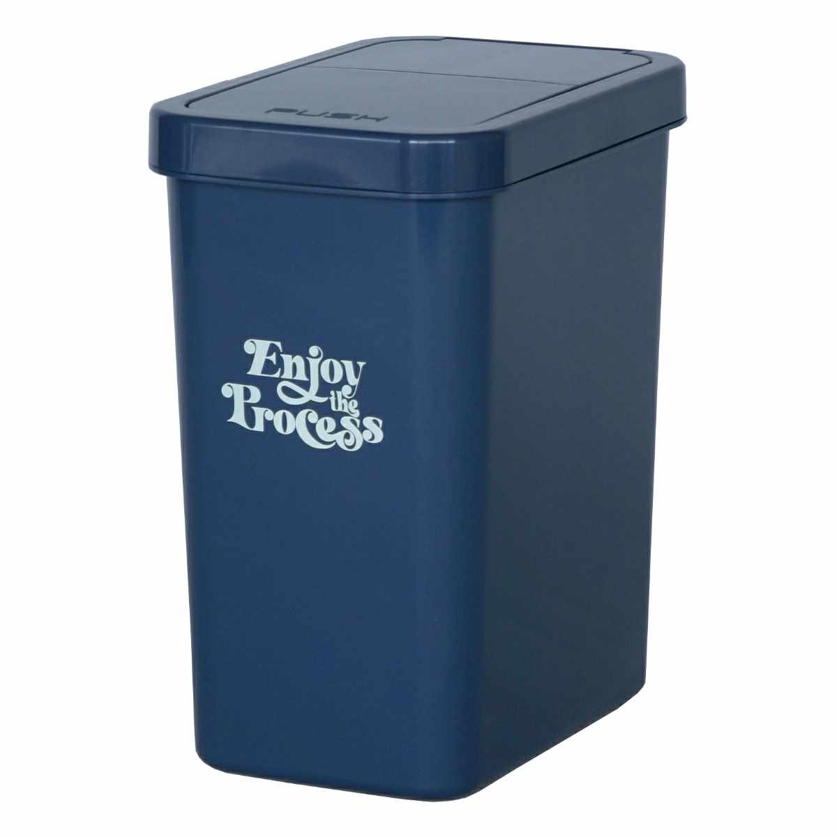 英字ロゴがアクセントのスタイリッシュなゴミ箱です。表面はマットな質感で主張しすぎず、落ち着いた雰囲気です。