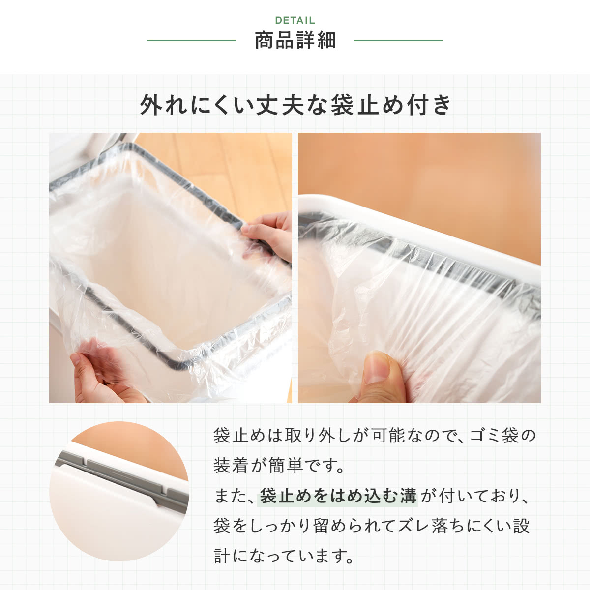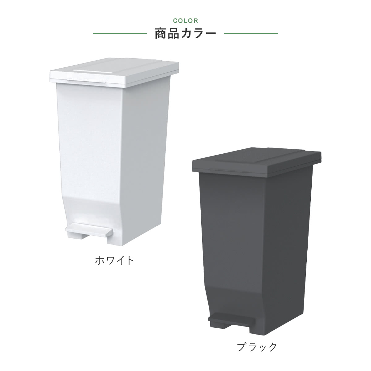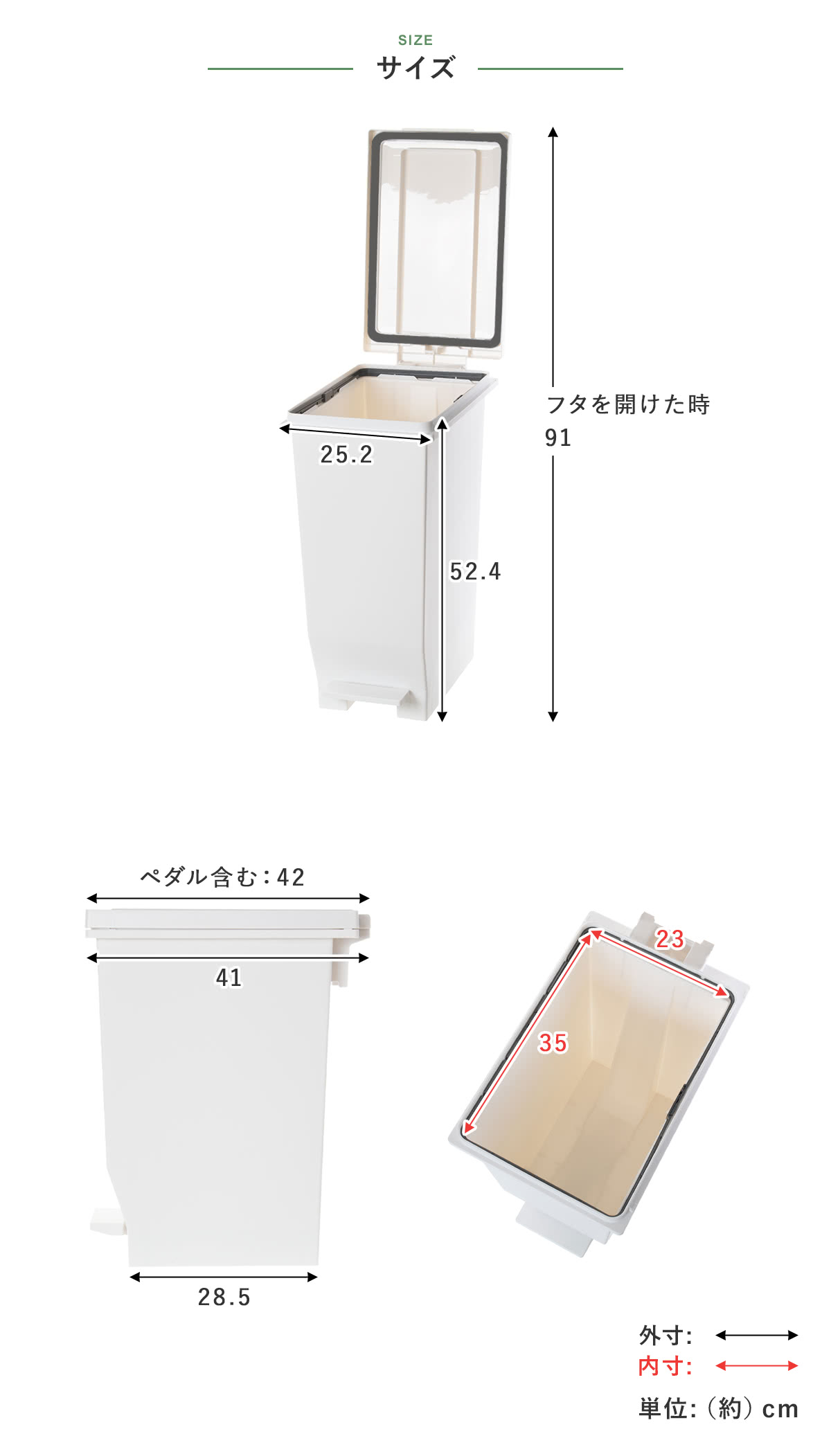 | 材質 | 本体・ふた・ポリ袋止め・ペダル:ポリプロピレン ペダルロッド:スチール パッキン:ポリエチレン |