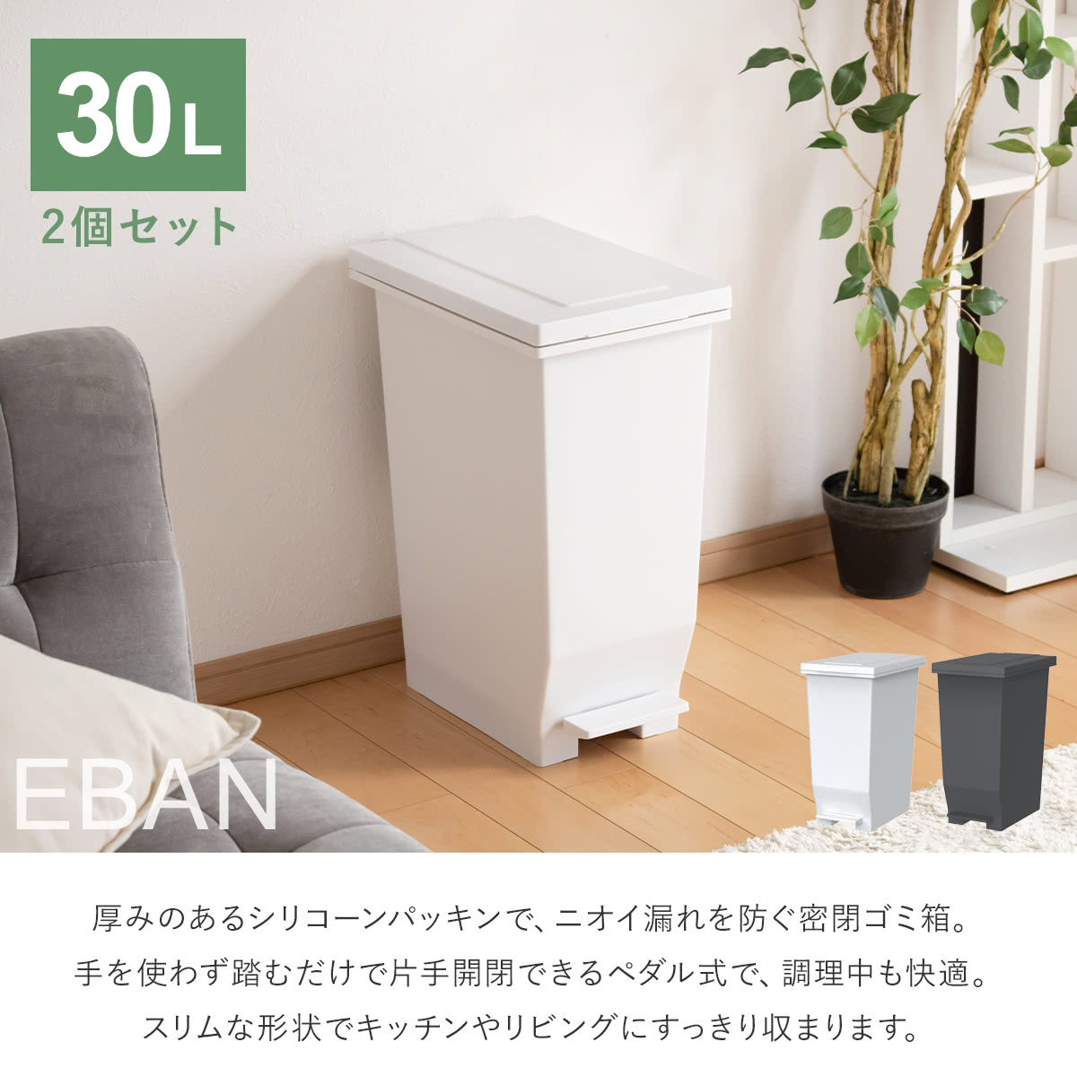 ゴミ箱 30L 同色2個セット 密閉ペダルペール エバン ( ごみ箱 30リットル 2個セット ニオイ漏れ 防止 密閉 スリム シンプル 分別 ペダル式 パッキン EBAN 袋止め付き 踏みふた ペダル 縦型 オムツペール キッチン ふた付き ) 【ブラック】