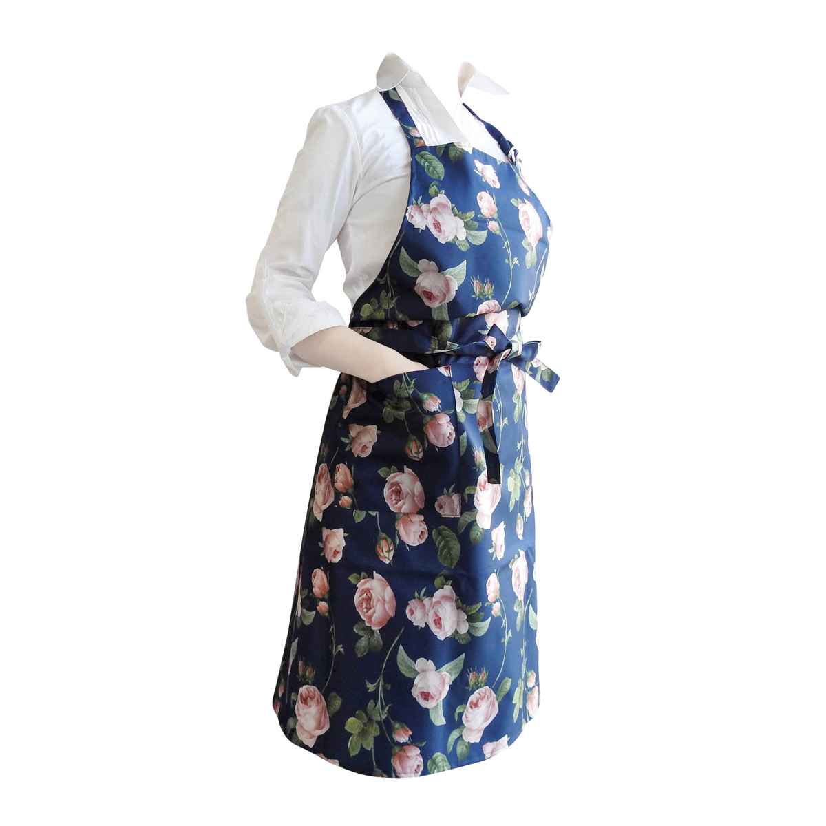 エプロン ポリエステル 100% ポケット付き 花柄 ローズ Abeille ( アベイル キッチンエプロン 台所エプロン 前掛け レディース 大人用 カフェエプロン 花柄エプロン ホルターネック キッチン用品 )【 ブルー 】