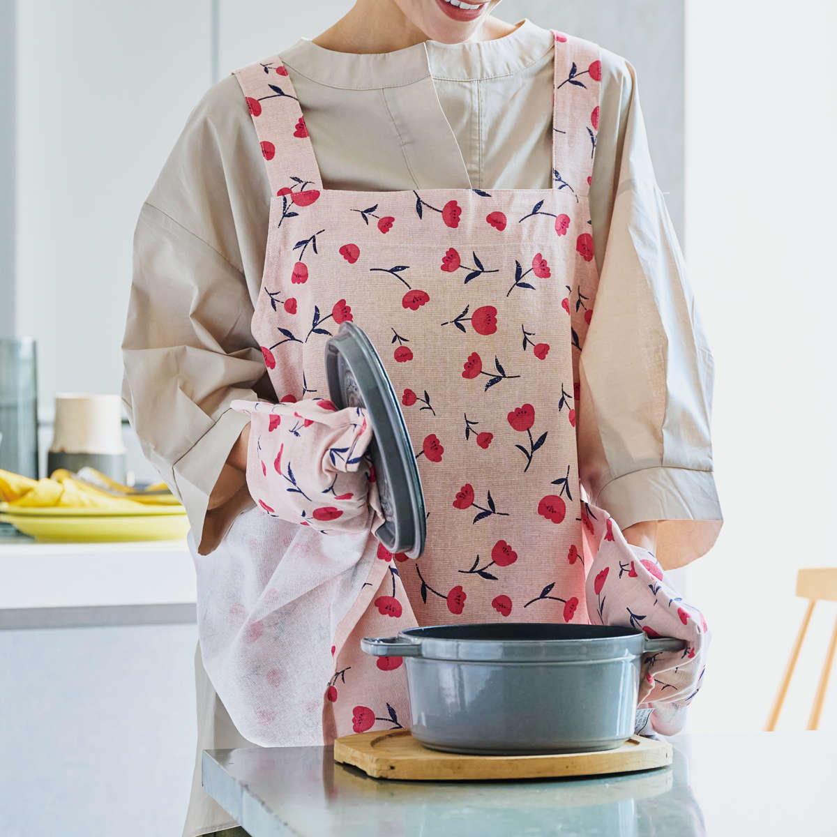 バッククロスタイプで、紐を結ぶ必要がなく被るだけでいいので素早く楽に身につけられます。また、長時間つけいていても疲れにくいから作業やお料理がはかどります。