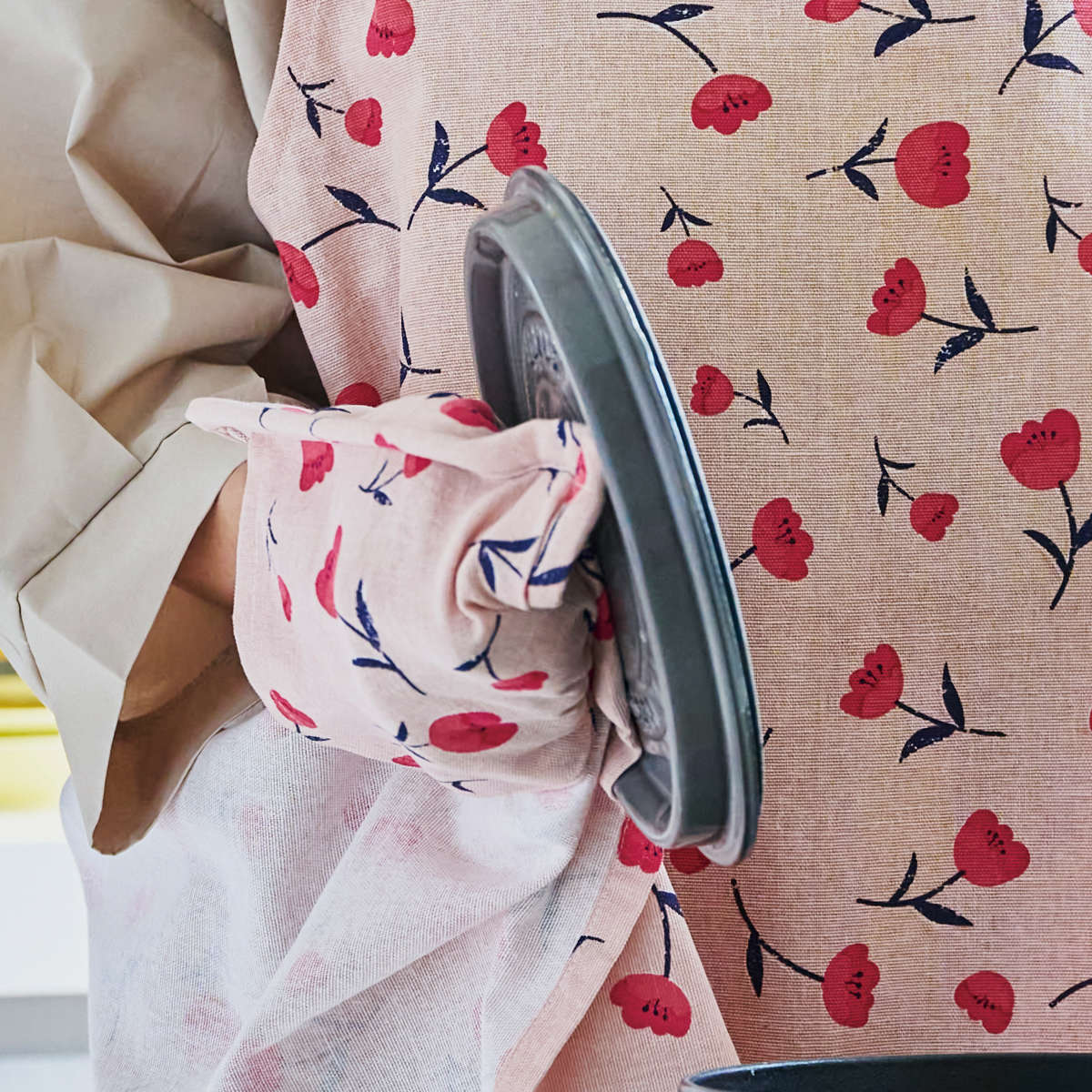 背面のすそには、ポケットのように手を入れて使えるミトンが付いています。ミトンに手をスッと入れれば、すぐに鍋ややかんなどの熱いものを持つことができます。お料理をしていてミトンを使いたいときに、探さなくてもワンアクションでミトンが使えるので、とても便利です。