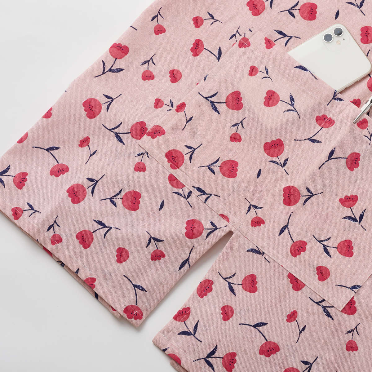 真ん中に仕切りのある大きな前ポケットが付いています。ヘアクリップなどの小物や携帯、メモ帳などを分けて入れておくことができます。お料理中や作業中も大活躍します。