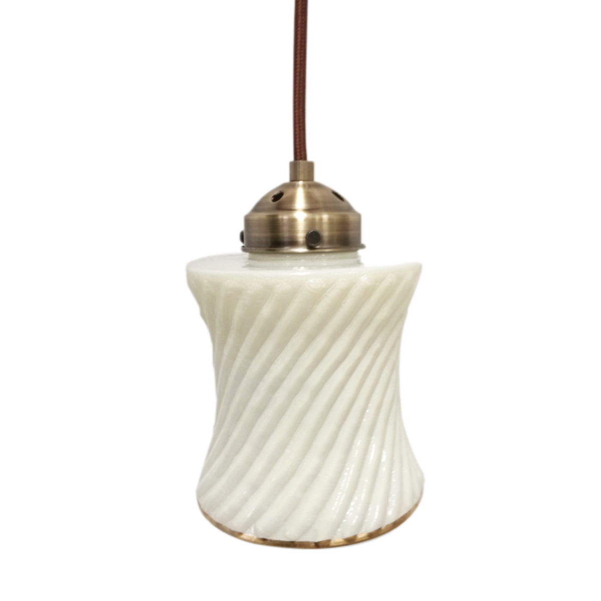 白いガラスでつくられたミルクシェードです。アンティークやヴィンテージの照明器具では定番で人気のデザインです。こちらも筋模様が入っているので、点灯すると模様が美しく浮かび上がります。