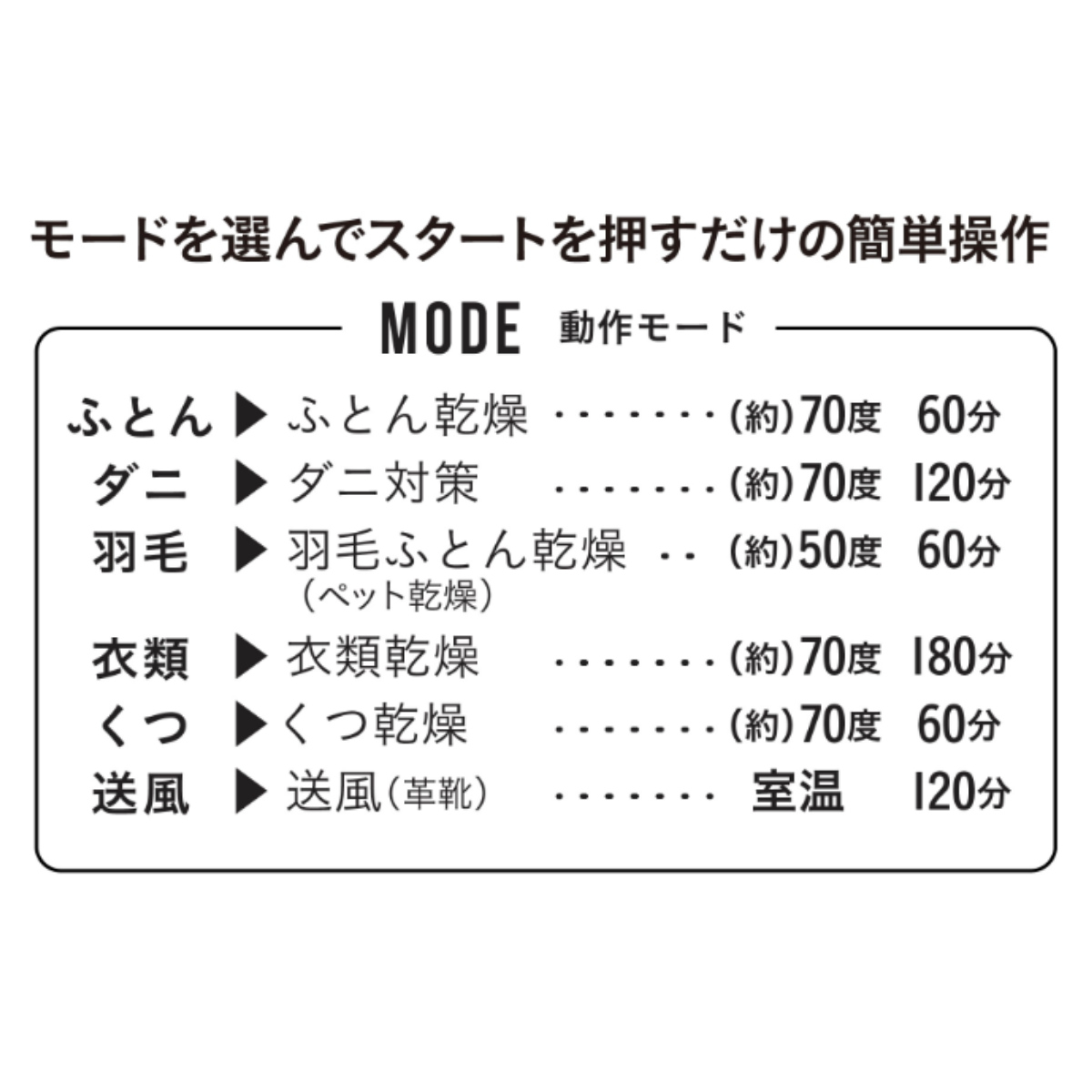 1年を通して活躍する多機能ドライヤーです。布団やくつの乾燥、ペットのドライなど、暮らしのさまざまなシーンでお使いいただけます。操作はモードを選んでボタンを押すだけの、わかりやすい簡単設計です。タイマー機能付きなので、用途やお好みに合わせて時間設定も可能です。