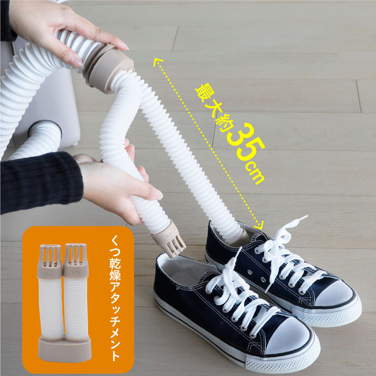 最長約35cmまで伸びる伸縮式くつ乾燥アタッチメント付きです。ブーツやスニーカーなど、つま先まで温風が届き、しっかり乾燥できます。