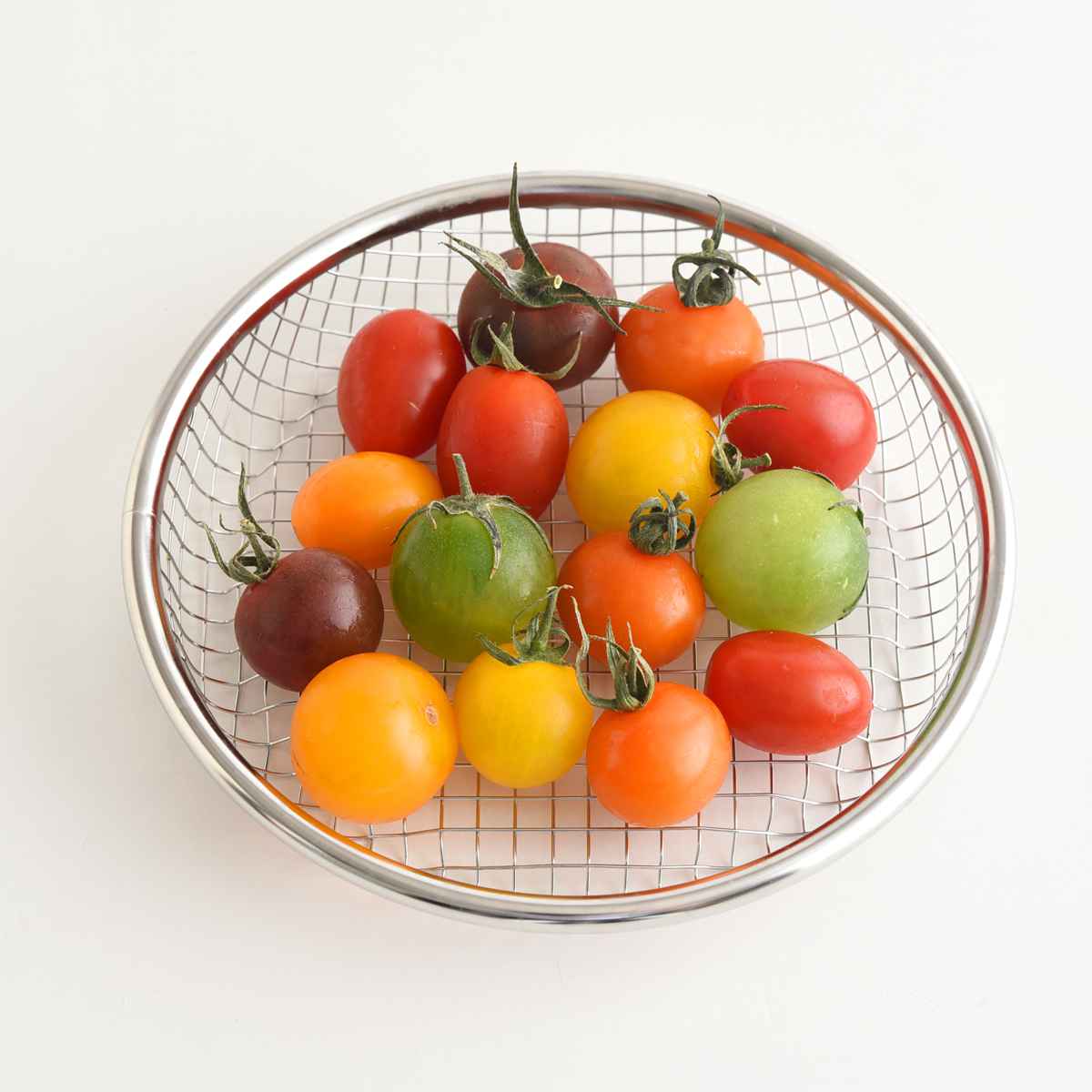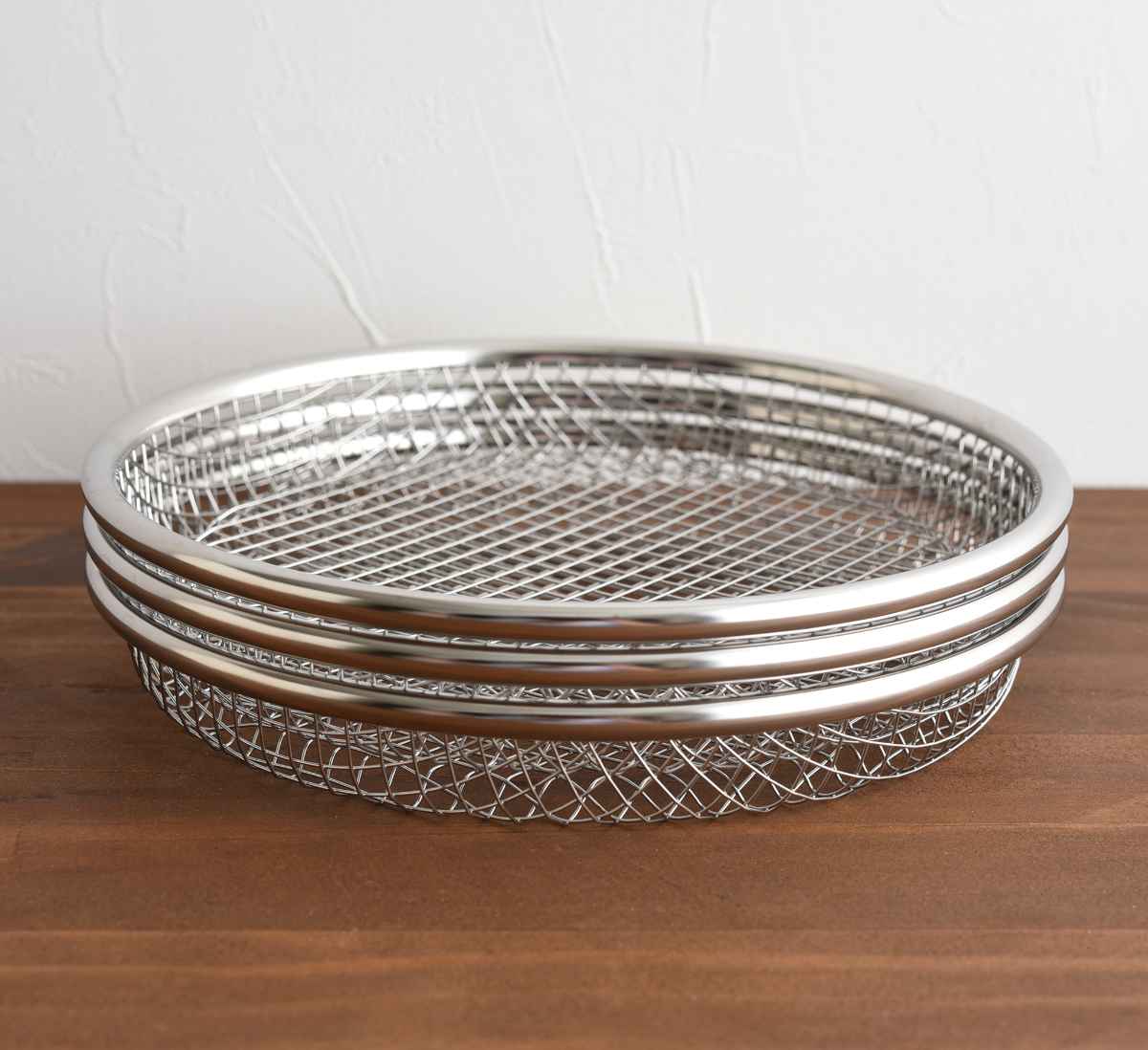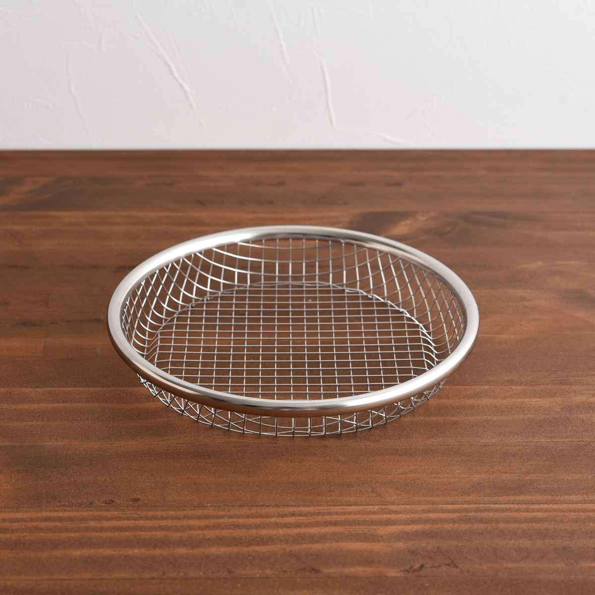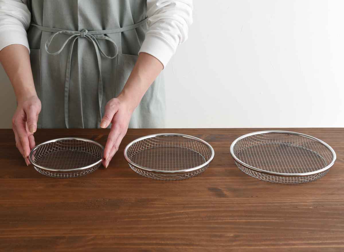 新潟県燕三条地域で生産された、ステンレス製の「お皿のための」ザルです。そのまま食卓に出せるように高級感のある仕上げにこだわりました。ご自宅にあるお皿と組み合わせて使うことで、ザルとお皿の間に隙間ができ、熱や湿気が抜けて美味しさと食感をキープします。