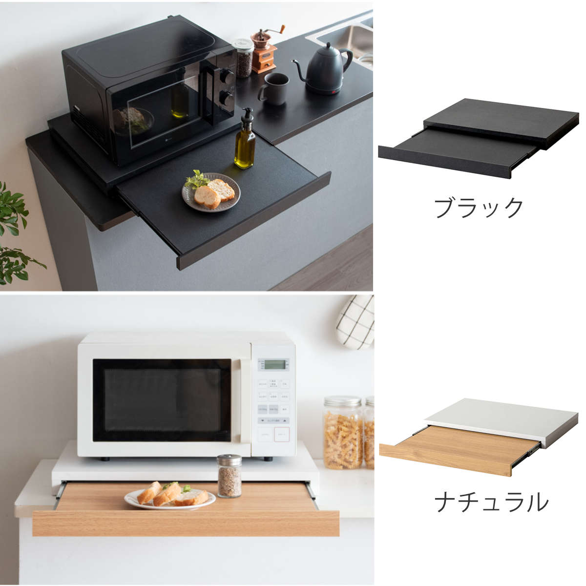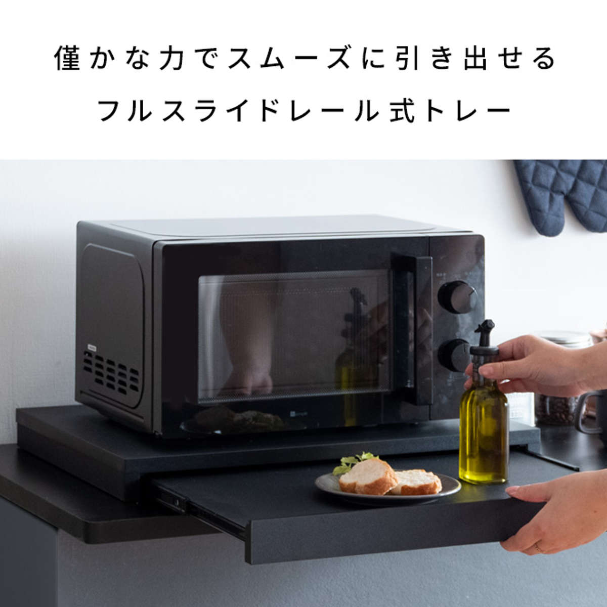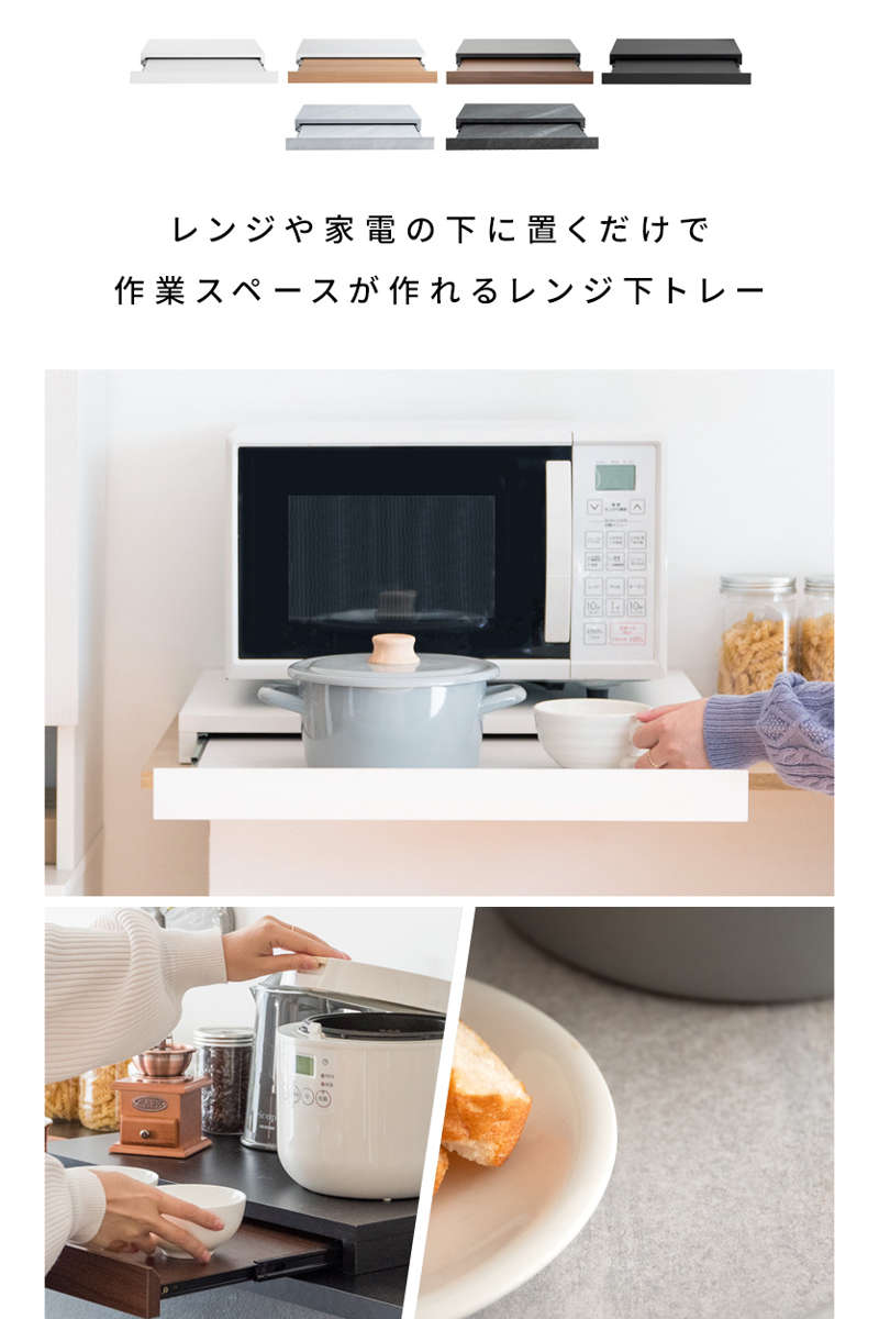 電子レンジや家電の下に置くだけで作業スペースが作れるレンジ下トレーです。