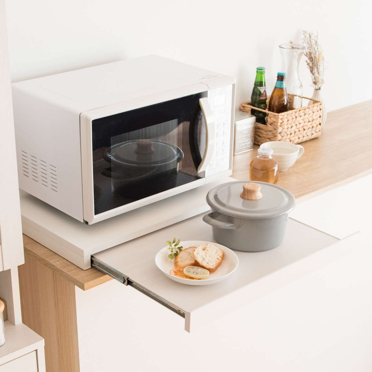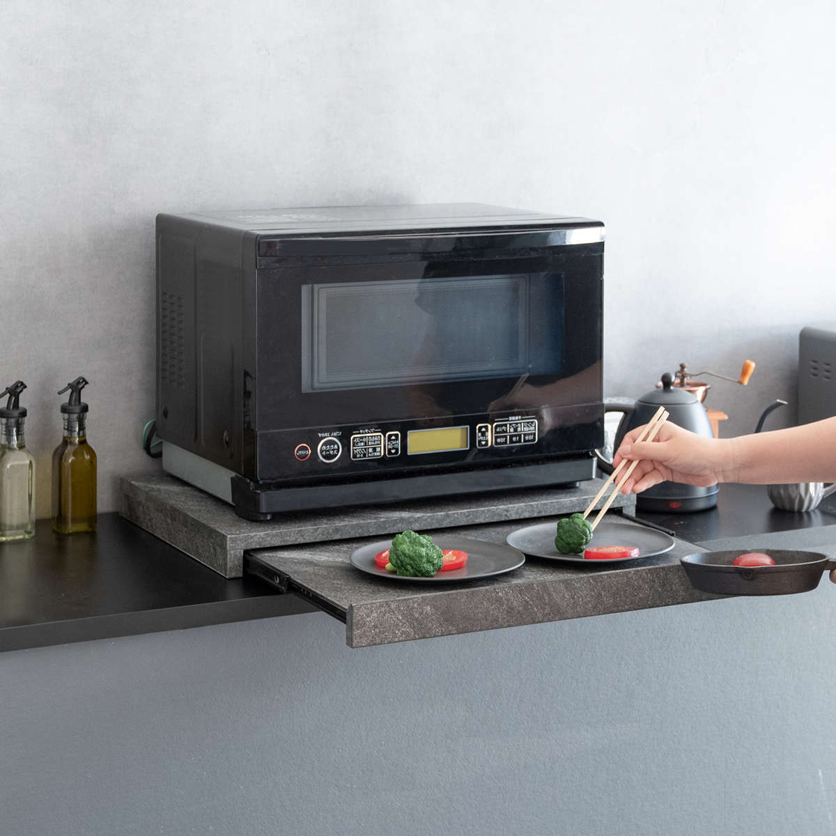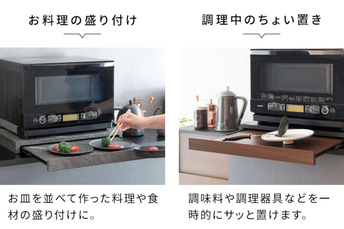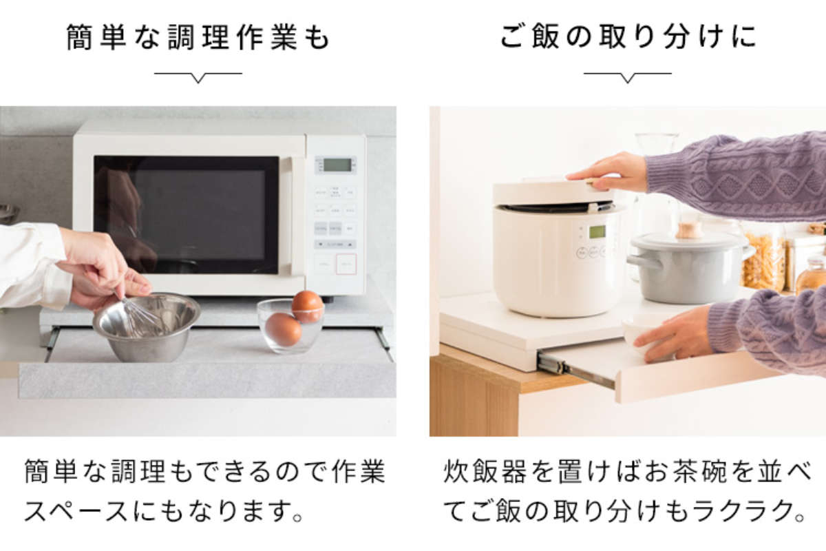 使わない時は邪魔にならず、必要な時だけ引き出せる便利なスライドトレーなので、手狭なキッチンのお家やワンルームの一人暮らしの方におすすめです。