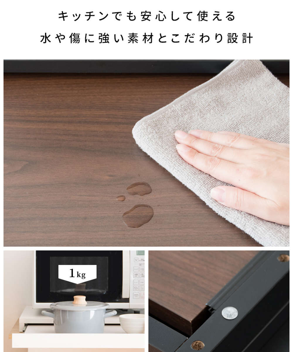 本体天板とトレー部分には、水や汚れ、傷に強いメラミン加工が施されています。濡れたり汚れたりしてもサッと拭くだけでキレイになり、お手入れが簡単です。