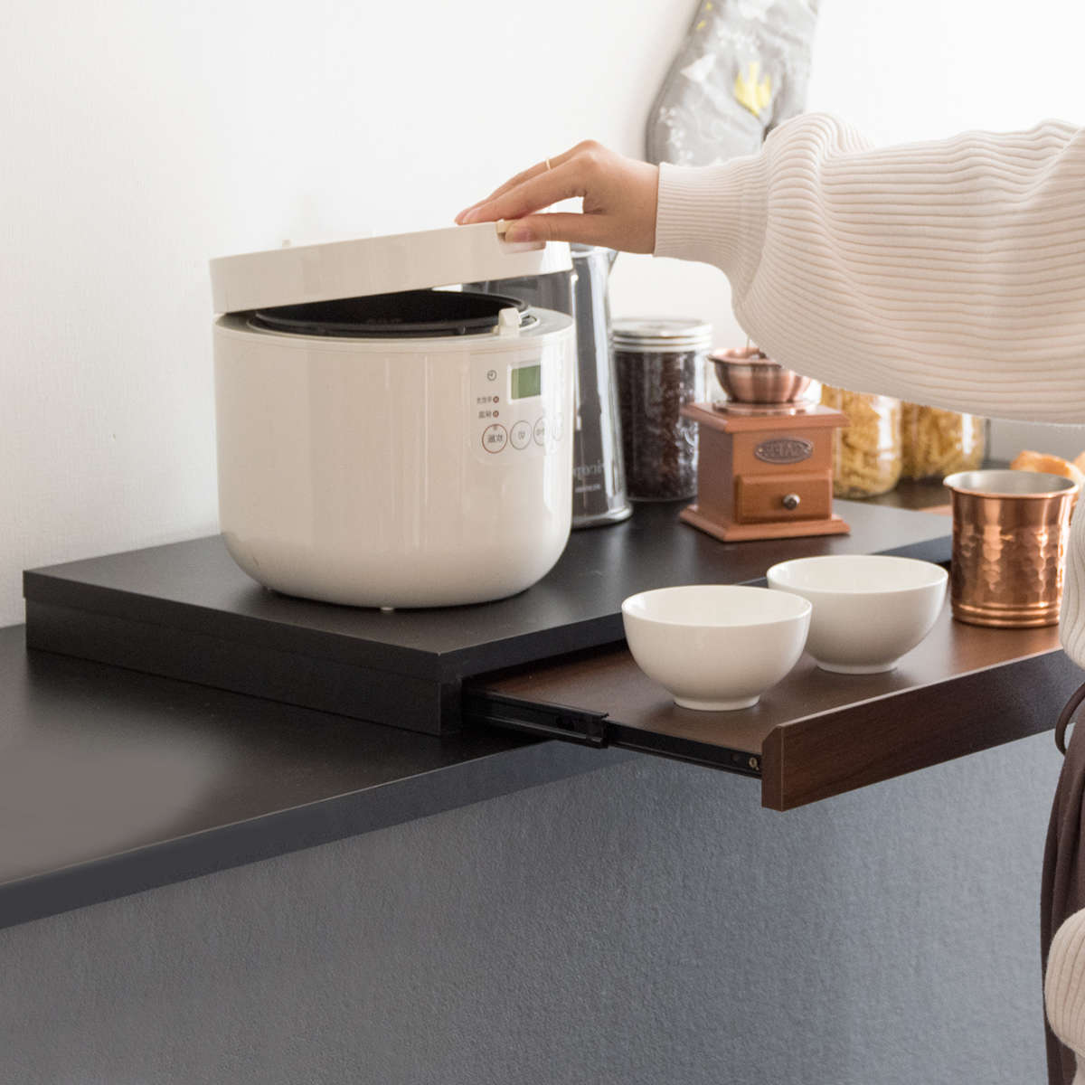 天板に炊飯器を設置して、ご飯をよそう時にお茶碗を並べたり、一時的に置きたい鍋のフタやお玉などの調理器具を置いたりと様々な使い方ができます。