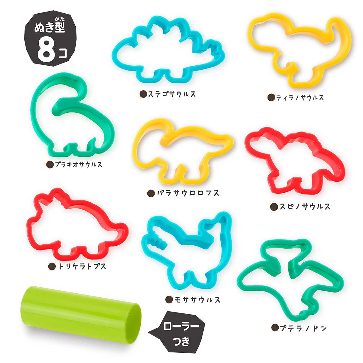 ●8種類の「きょうりゅう」のねんどぬき型とローラーのセットです。