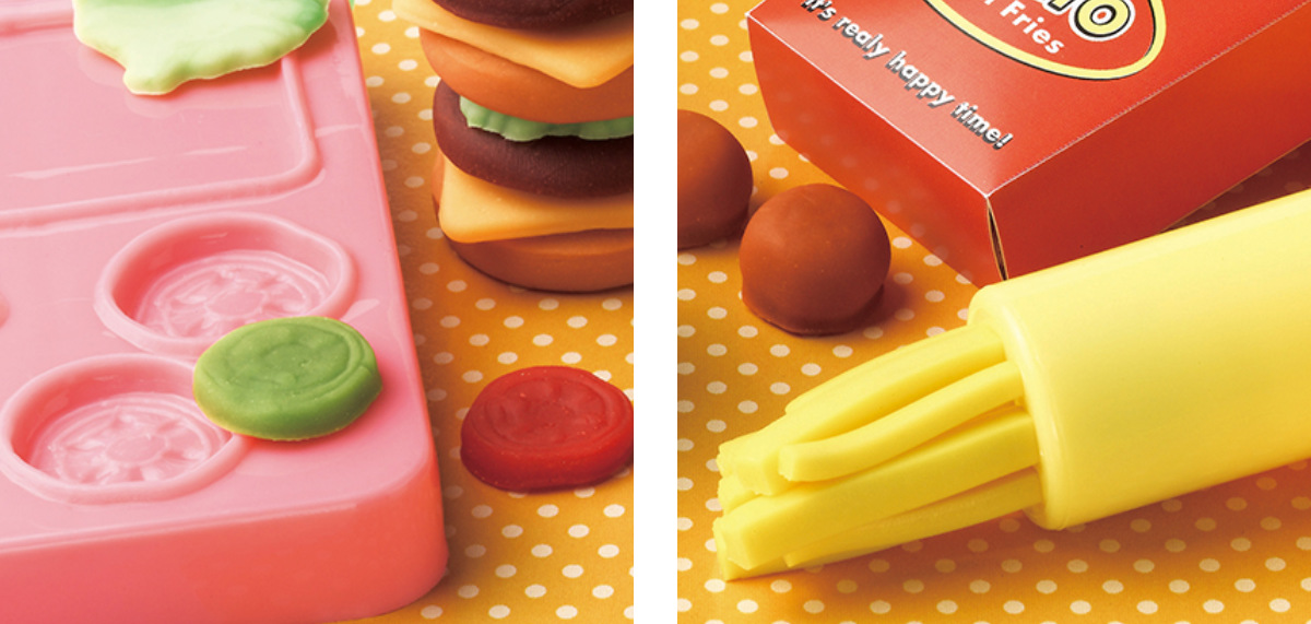 ●4色のねんどと押し型を使って、本物そっくりなハンバーガーやポテト、ナゲットが作れます。