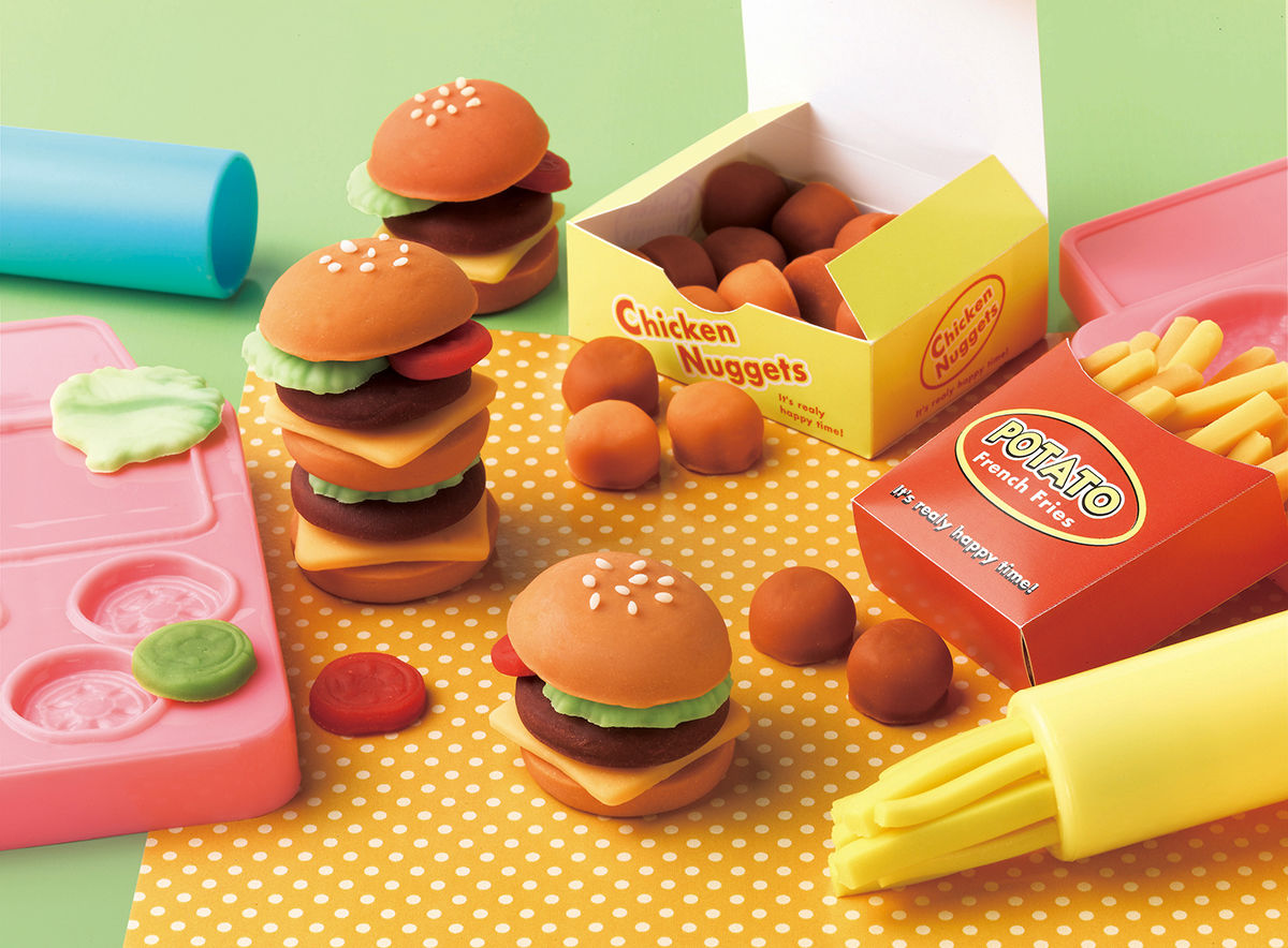 原料に小麦粉・水・食塩を使った、安心・安全な素材で出来ているねんどです。ねんど遊びは手や指先を使う事で脳の発達を促し、自由な発想と豊かな創造力を養います。4色のねんどと押し型を使って、本物そっくりなハンバーガーやポテト、ナゲットが作れます。
