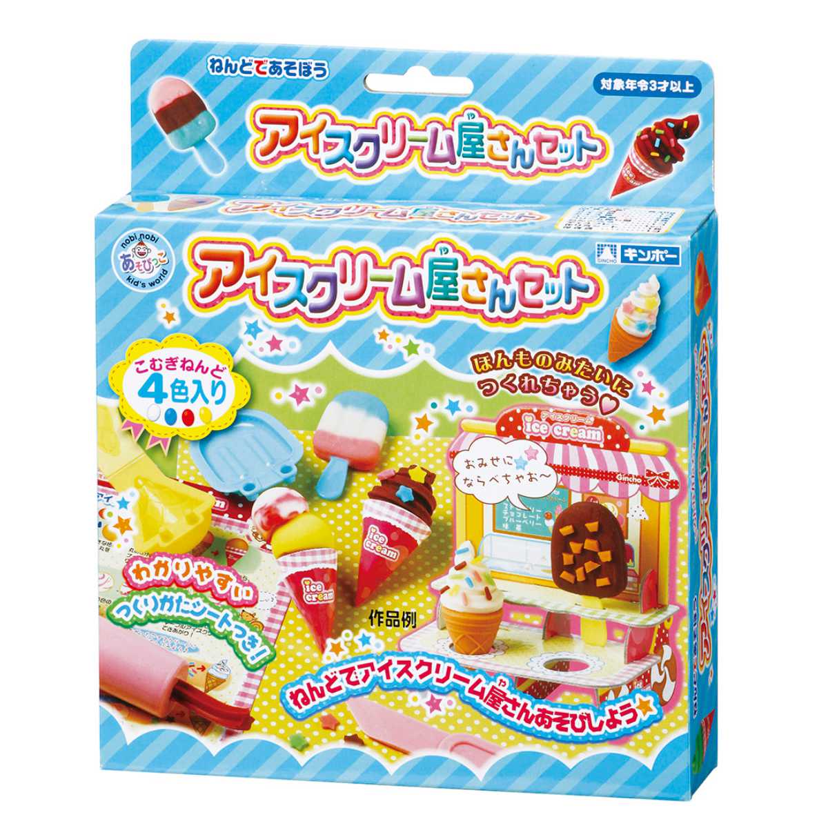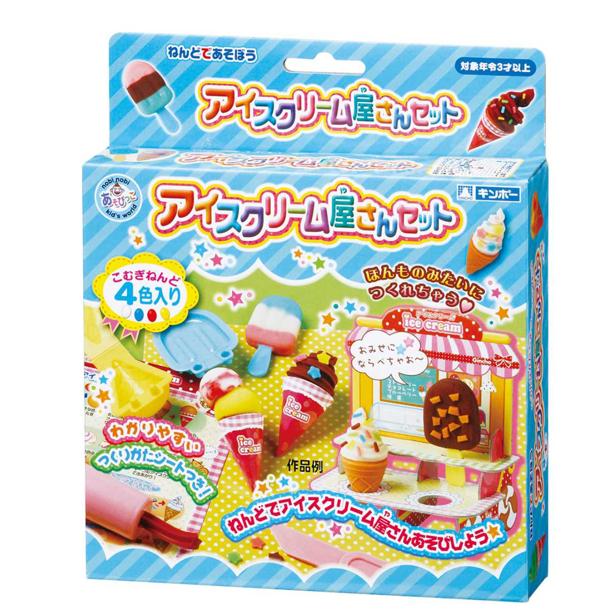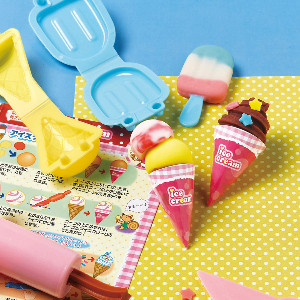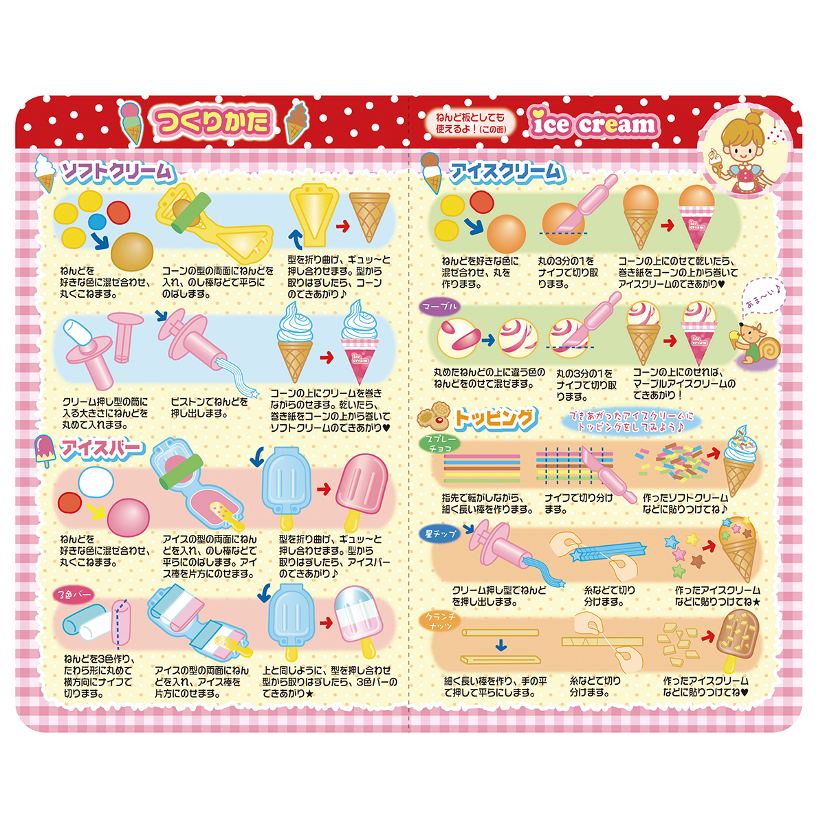 | 内容量 | 小麦ねんど4色(白、青、赤、黄)、コーン型、アイス型、アイス棒2本、コーン巻紙4枚、クリーム押し型、へら、ディスプレイ、作り方シート、保存袋 |