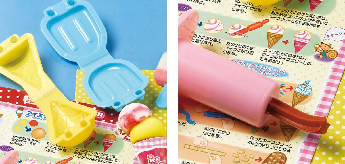 ●4色のねんどと押し型を使って、本物そっくりなアイスクリームが作れます。