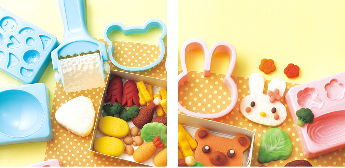 ●どうぶつ型2個、ご飯型ローラー、はし、おべんとう箱、保存袋が付属しています。