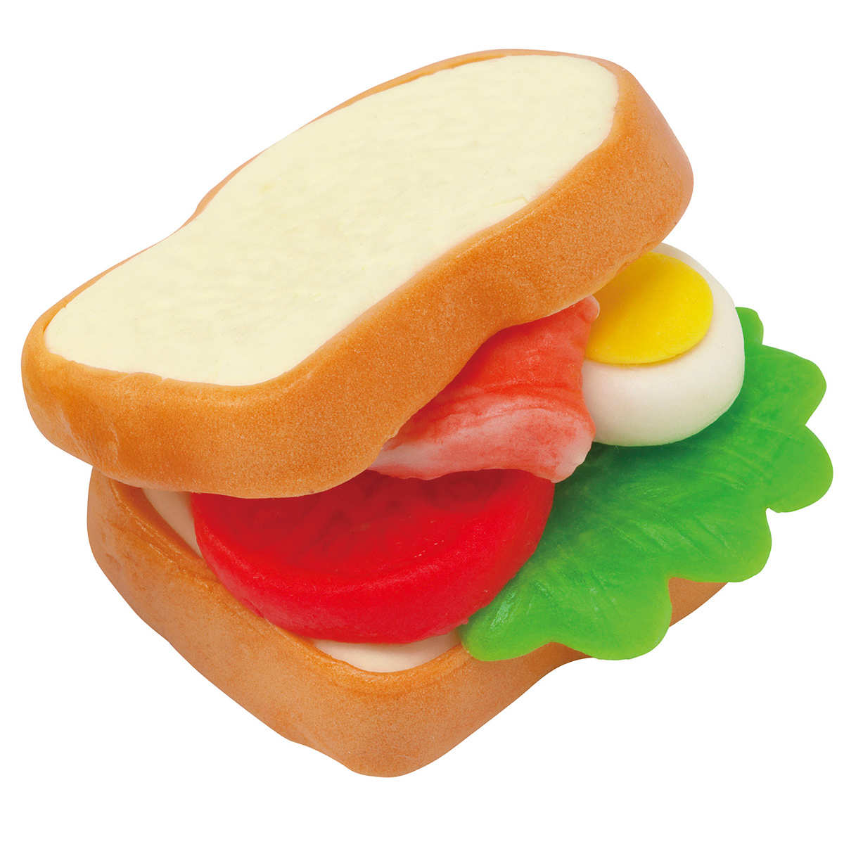4色のねんどの他に、いろいろなパンが簡単に作れる押し型が3個付属しています。レタスやベーコンなどの本物そっくりなサンドイッチの具材も作れます。