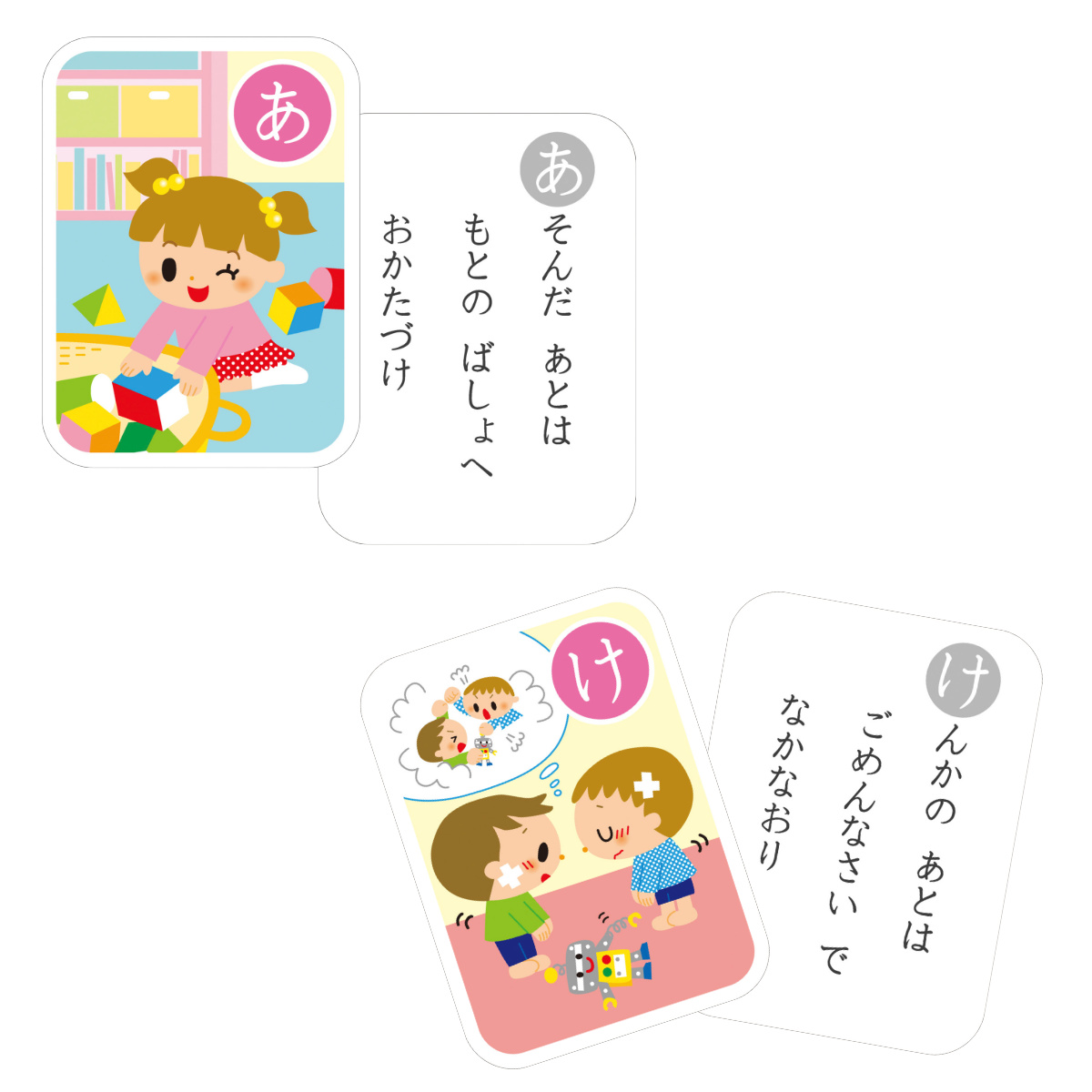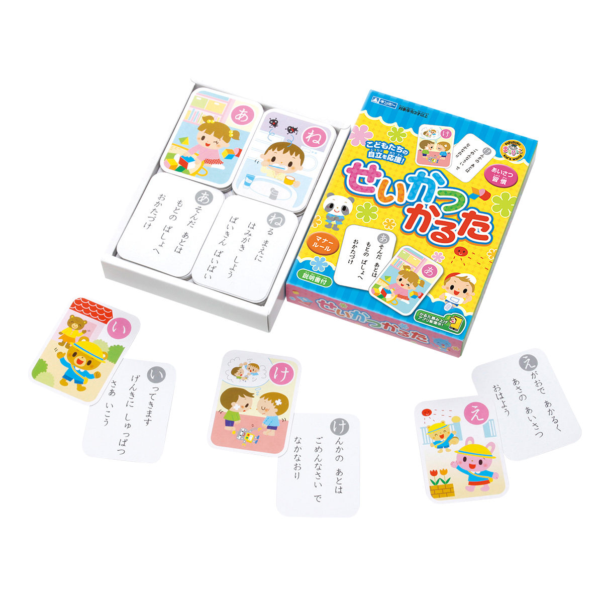 かるた遊びをしながら、日常生活のルールやマナー、習慣を覚えることができるかるたです。学びながらお子さまの自立を促し、自立心を養います。お子さまの成長に合わせて、遊び方を変えながら、徐々に生活習慣や社会ルールなどを身につけていきましょう。
