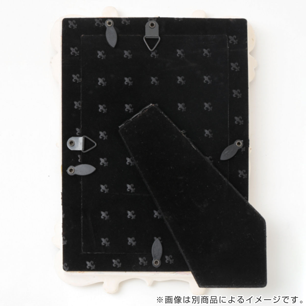 フォトスタンドとして立てて置くだけでなく、壁掛け用フックが付いているので壁にも取り付けられます。背面の素材はベルベット調で高級感があります。