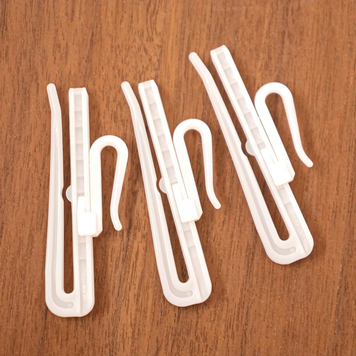 | アジャスターフックで高さ調整 レールを引っ掛ける部分を上下に移動させることで、カーテンの丈を約4cm長く、または約1cm短く調整できます。 | Bフック フックのタイプはBフック(レールを隠すタイプ)です。 |