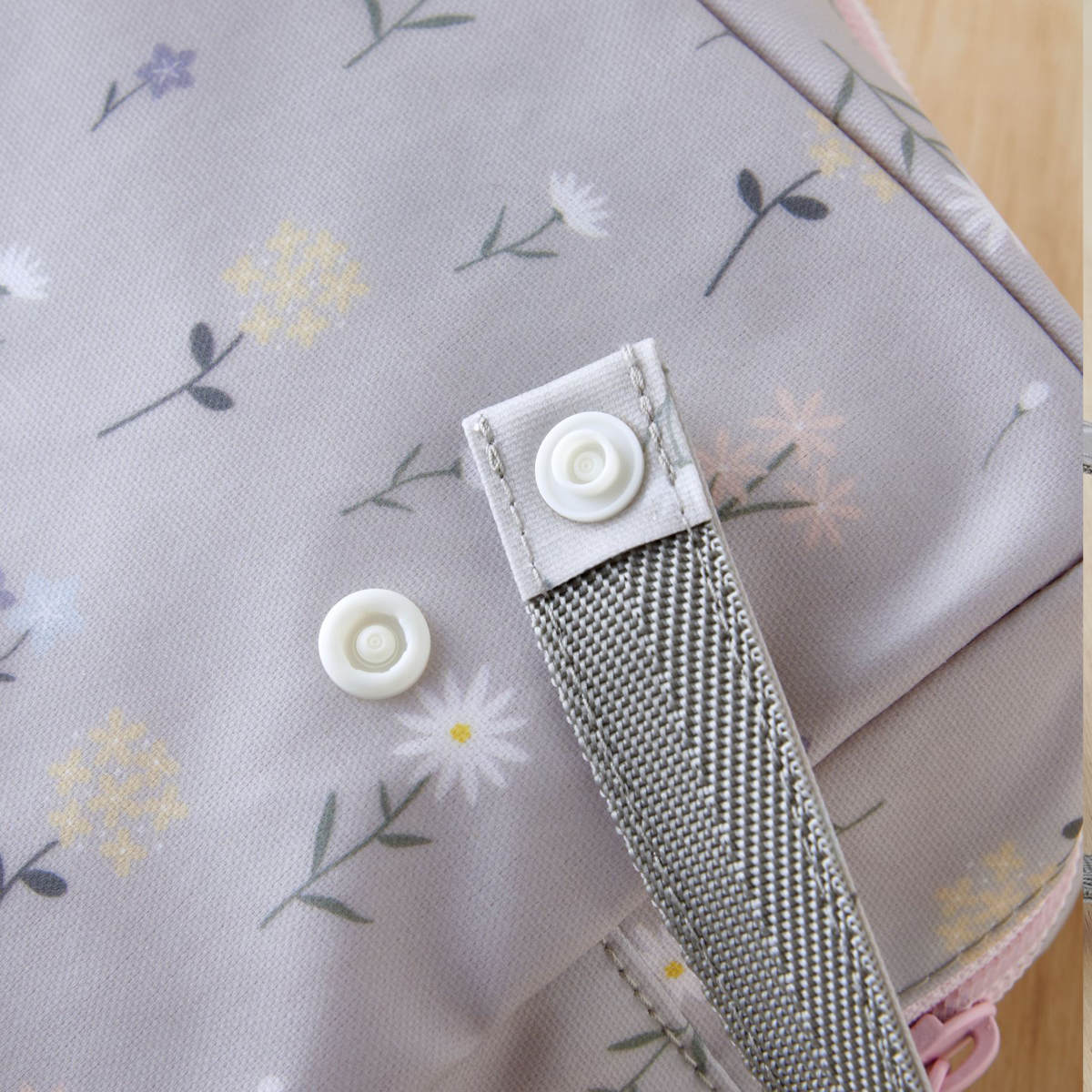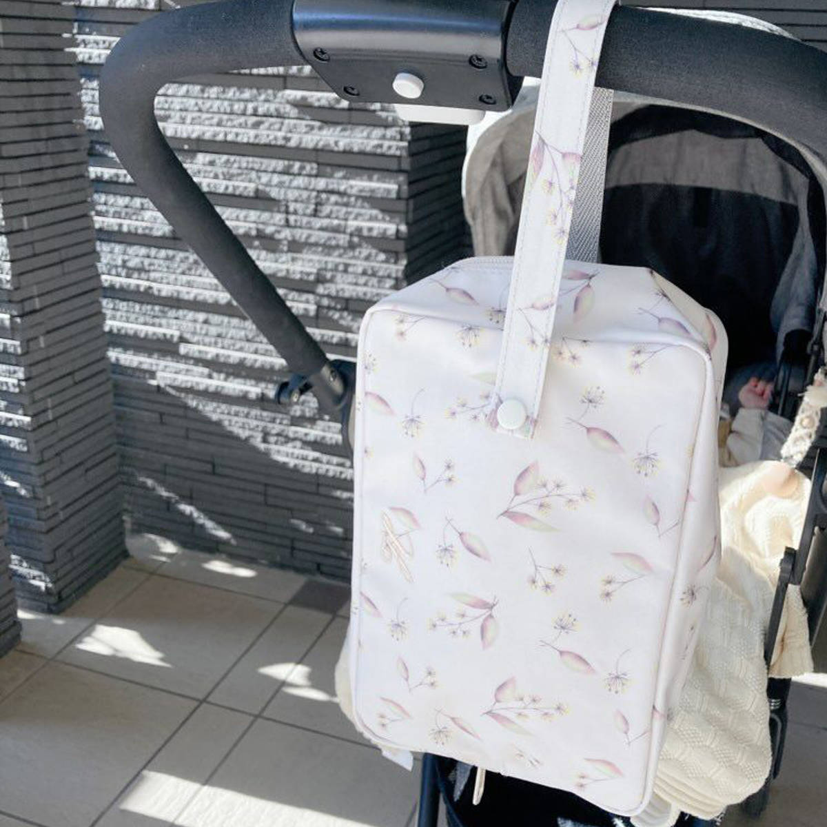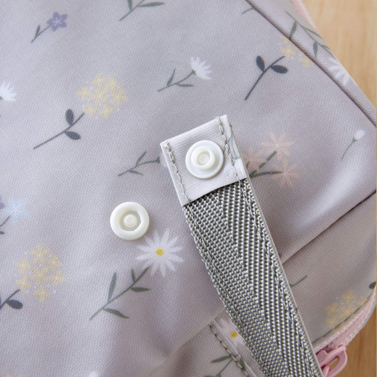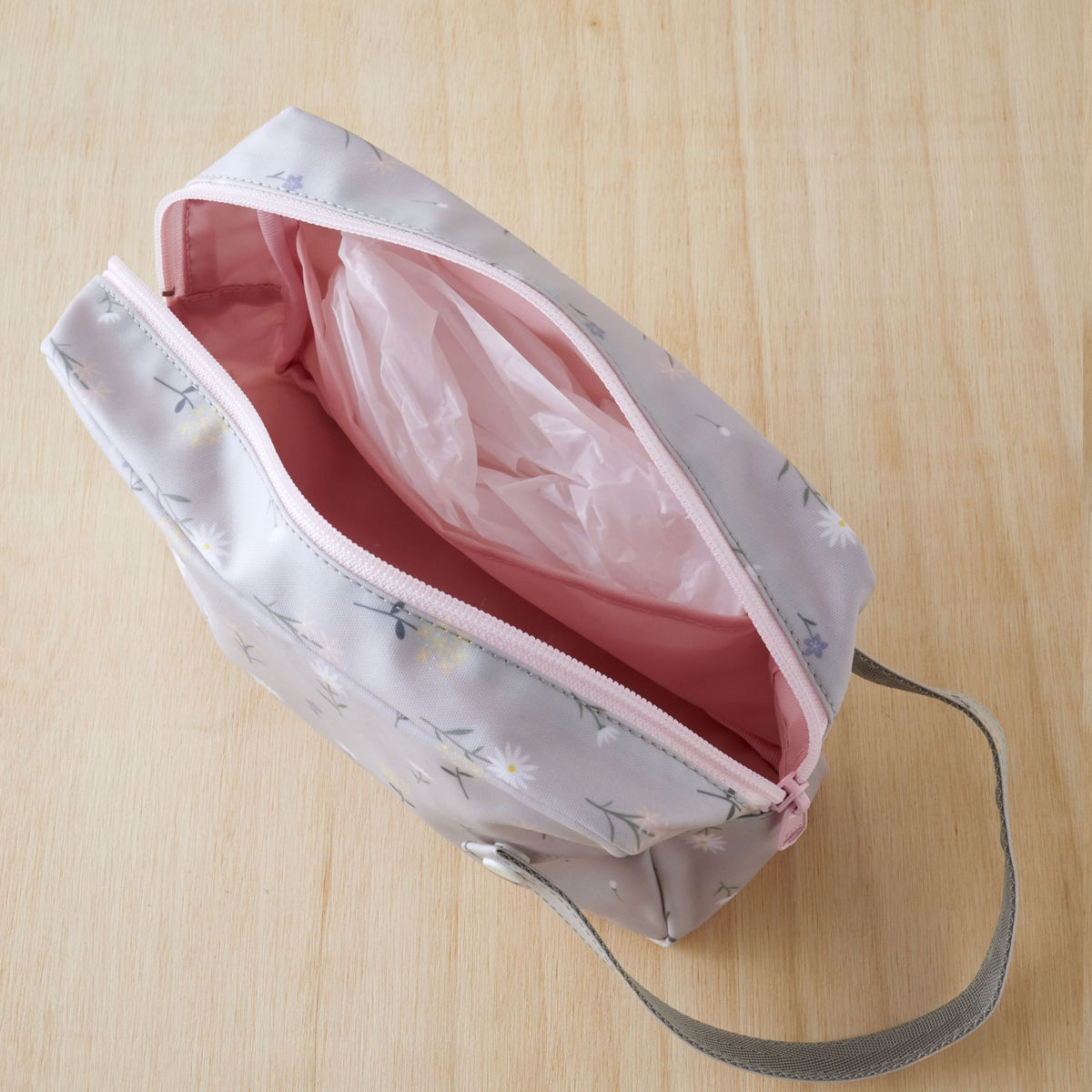 スナップボタンで、ベビーカーやバッグ、車のヘッドレストなどに吊るして便利にお使いいただけます。手にも通しやすい長さの持ち手なので、おむつ替えに行く際には持ち手に手を通して持ち運ぶことができます。