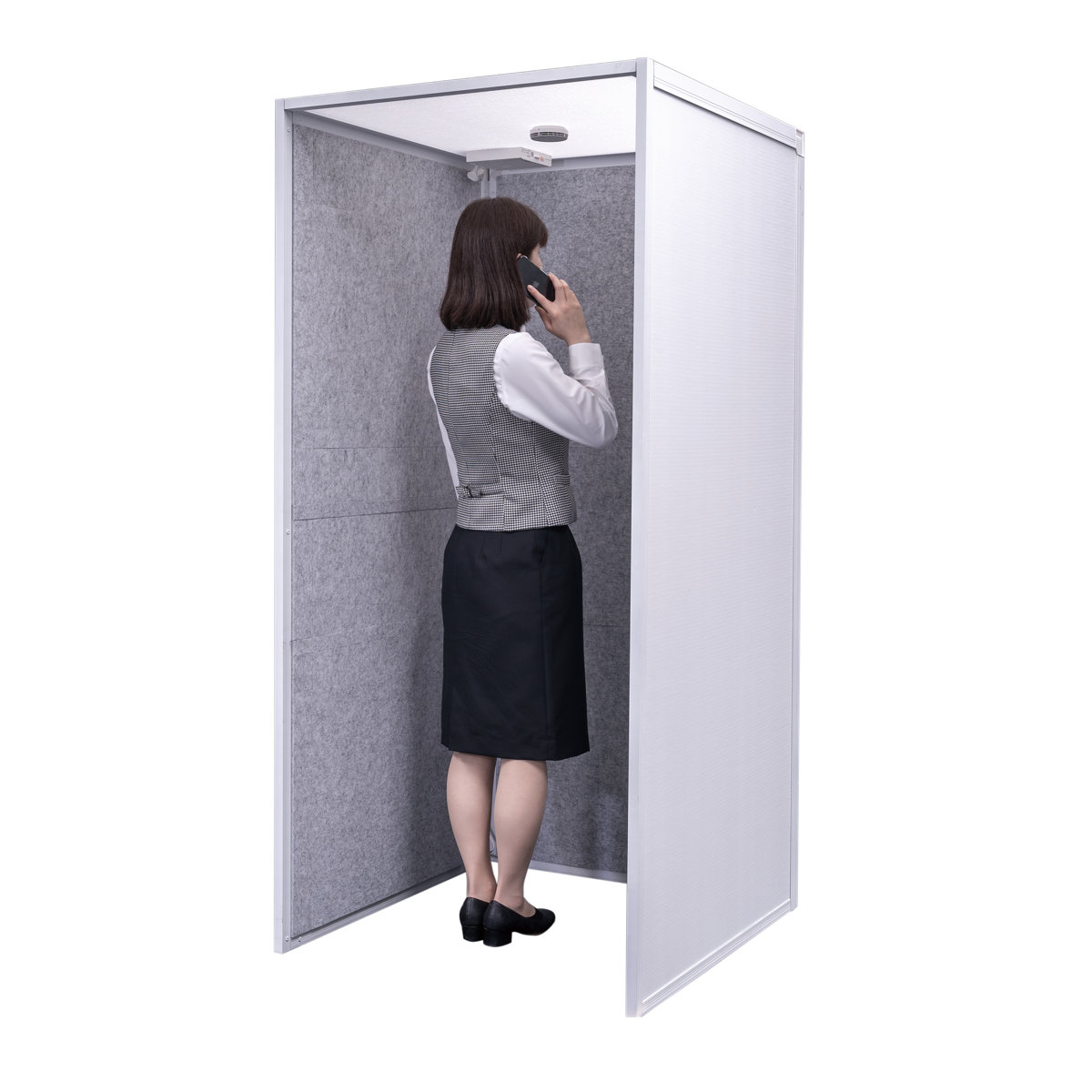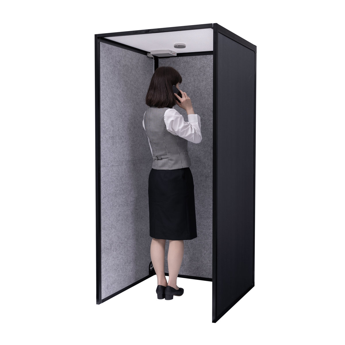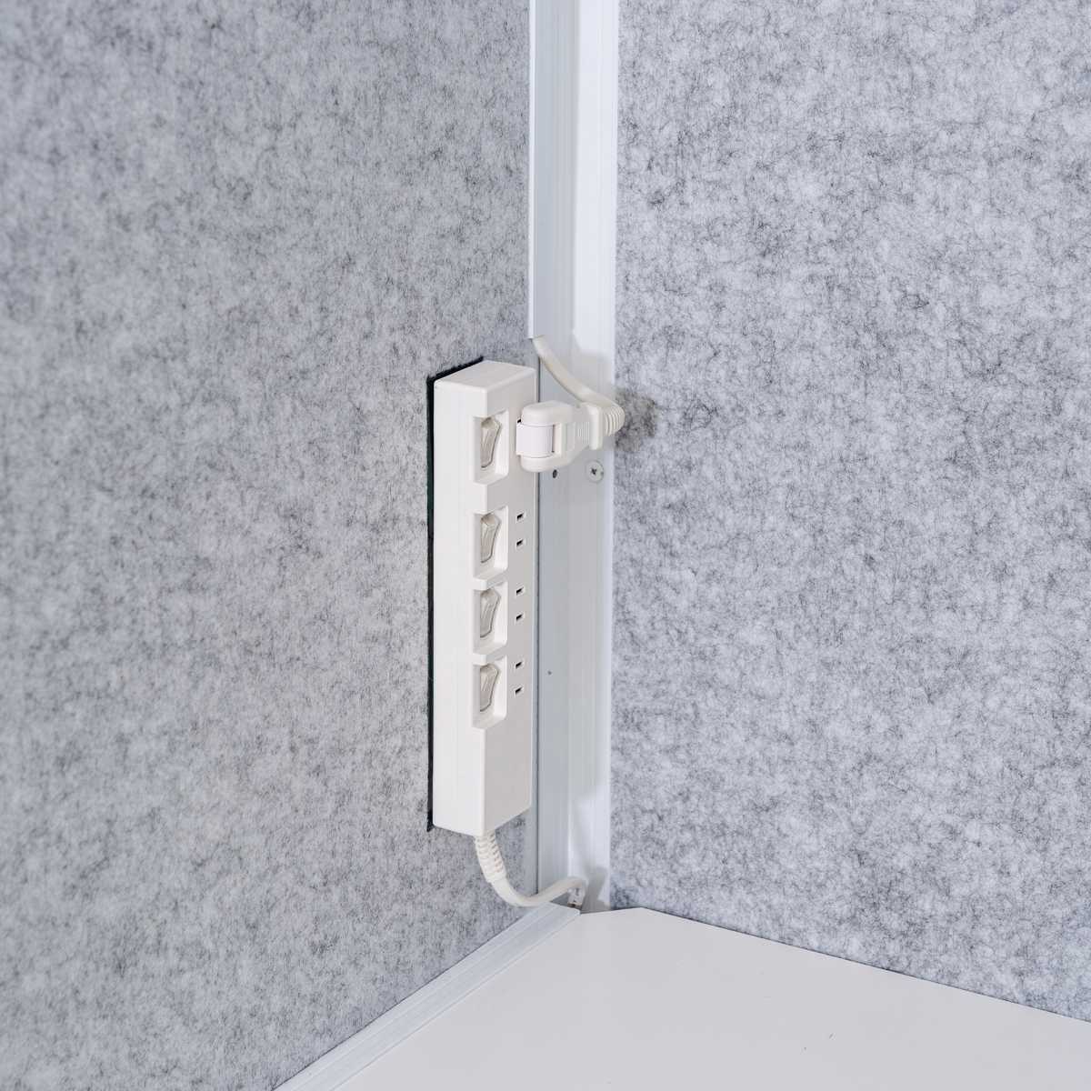 吸音ブーススタンドFは、電源タップ・換気ファン・火災報知器が付いています。快適さとコンパクトさを兼ね備えたタイプで、簡易的な電話ブースとしておすすめです。