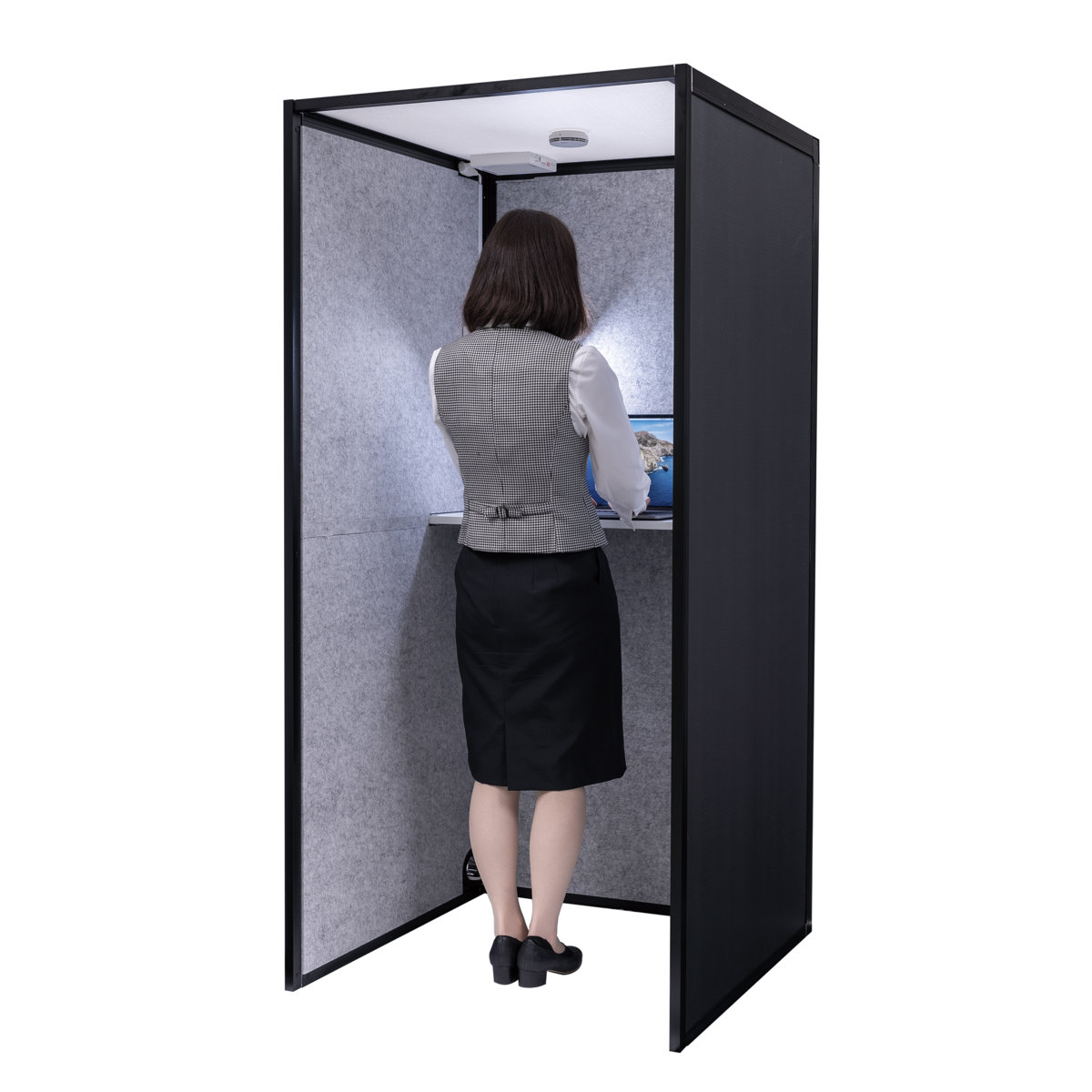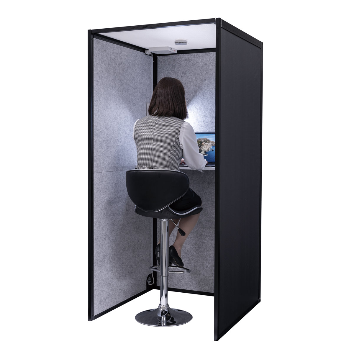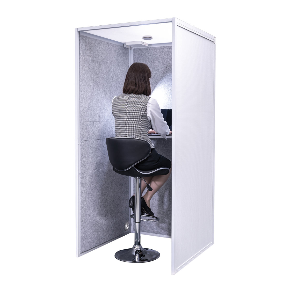 吸音ブーススタンドFTは、テーブル・電源タップ・換気ファン・火災報知器が付いています。テーブル付きなので、電話だけでなくパソコン作業も可能です。立ったまま手軽に使ったり、ハイチェアを合わせて座って使用することもできます。快適さとコンパクトさを兼ね備えたタイプです。