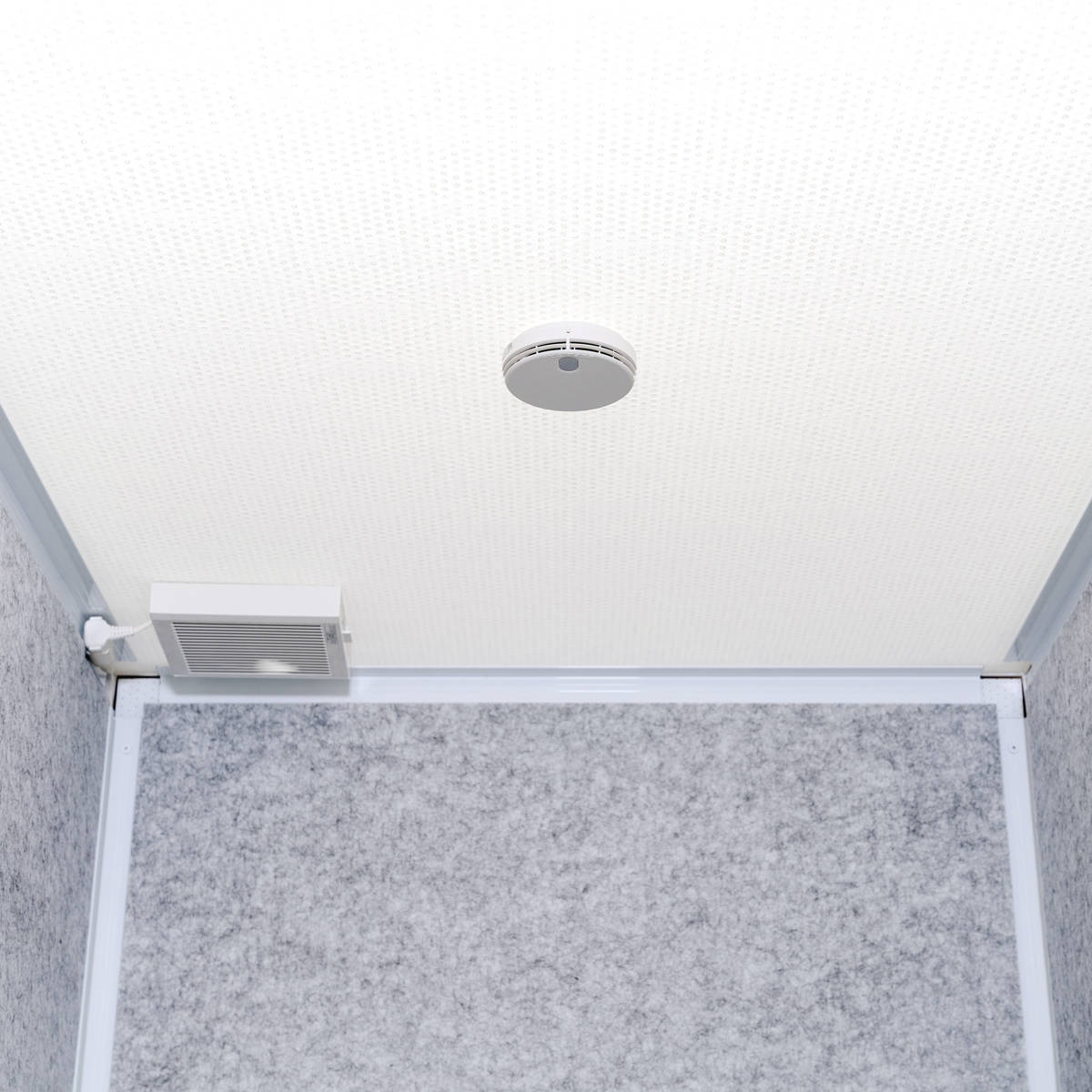 空気の入れ替えを行う換気ファンと火災報知器付きで、快適・安全です。また、天面は半透過で柔らかな採光です。