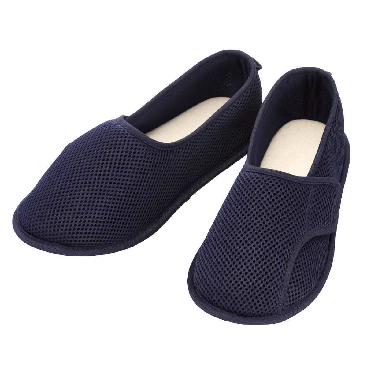 足腰が弱った方でも、なるべく楽に歩けるように軽い素材で作られています。(片方:Lサイズ 約110g)表地は通気性の良いメッシュ素材がムレを防ぎ、快適な履き心地です。中底には素足でも気持ちの良いパイル地を使用しています。