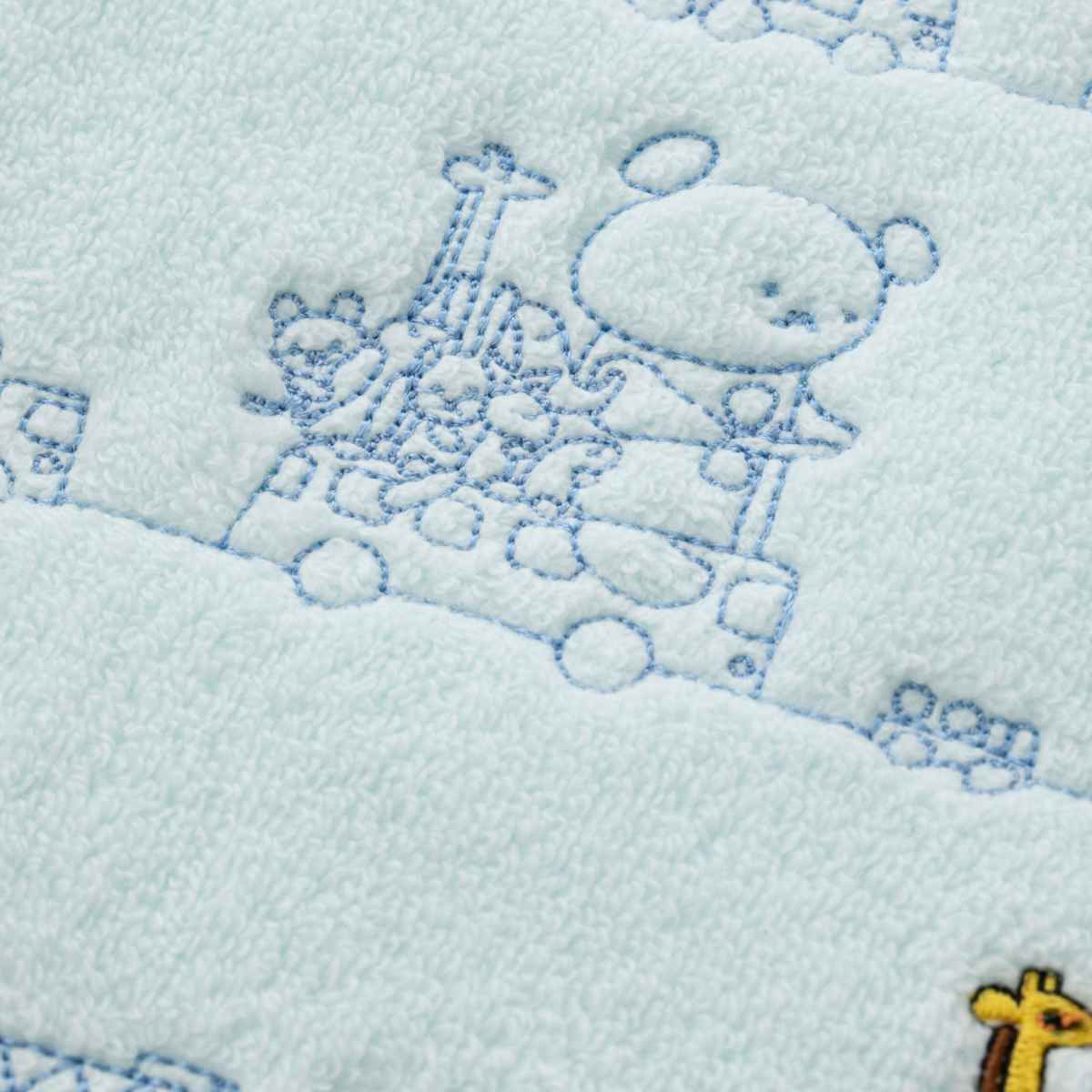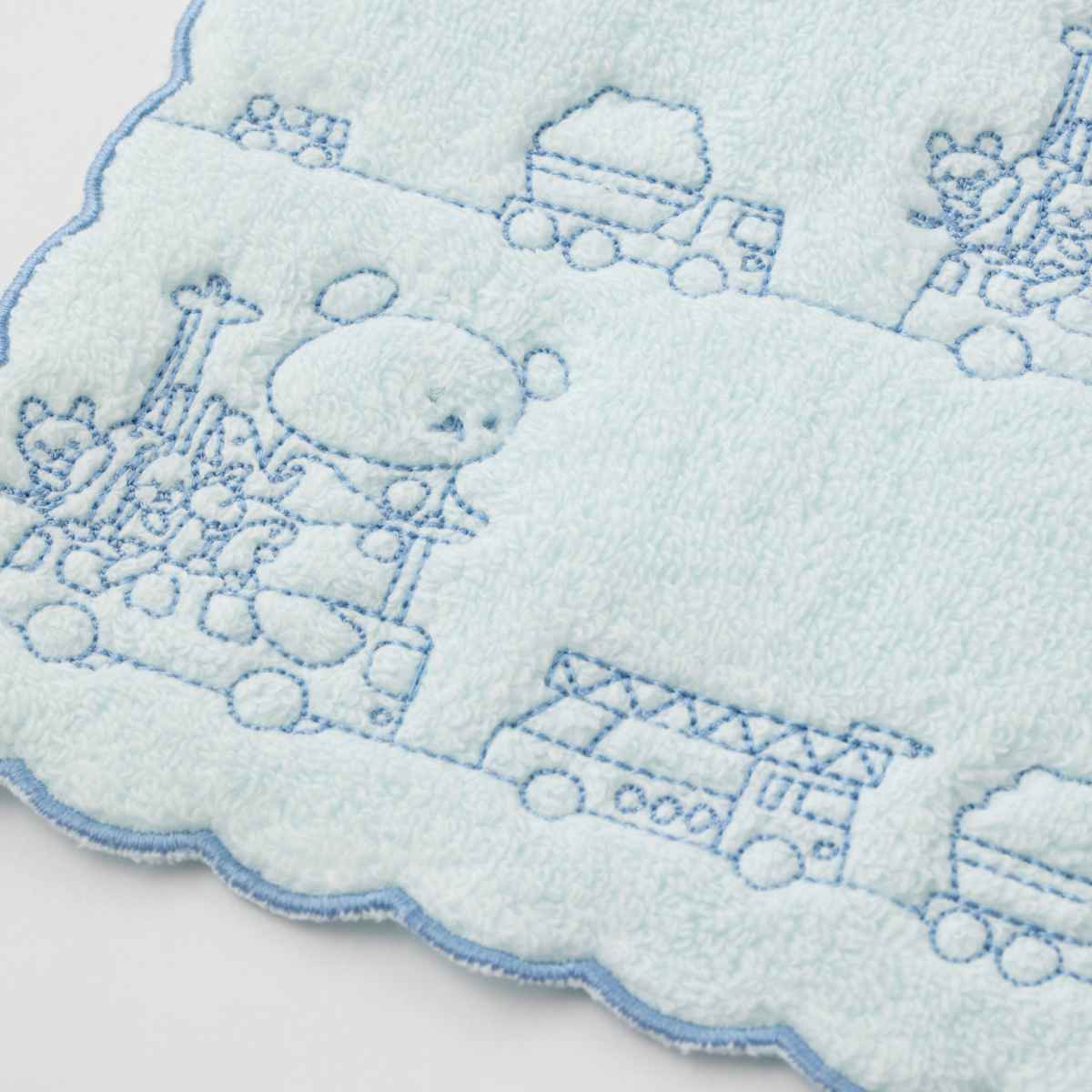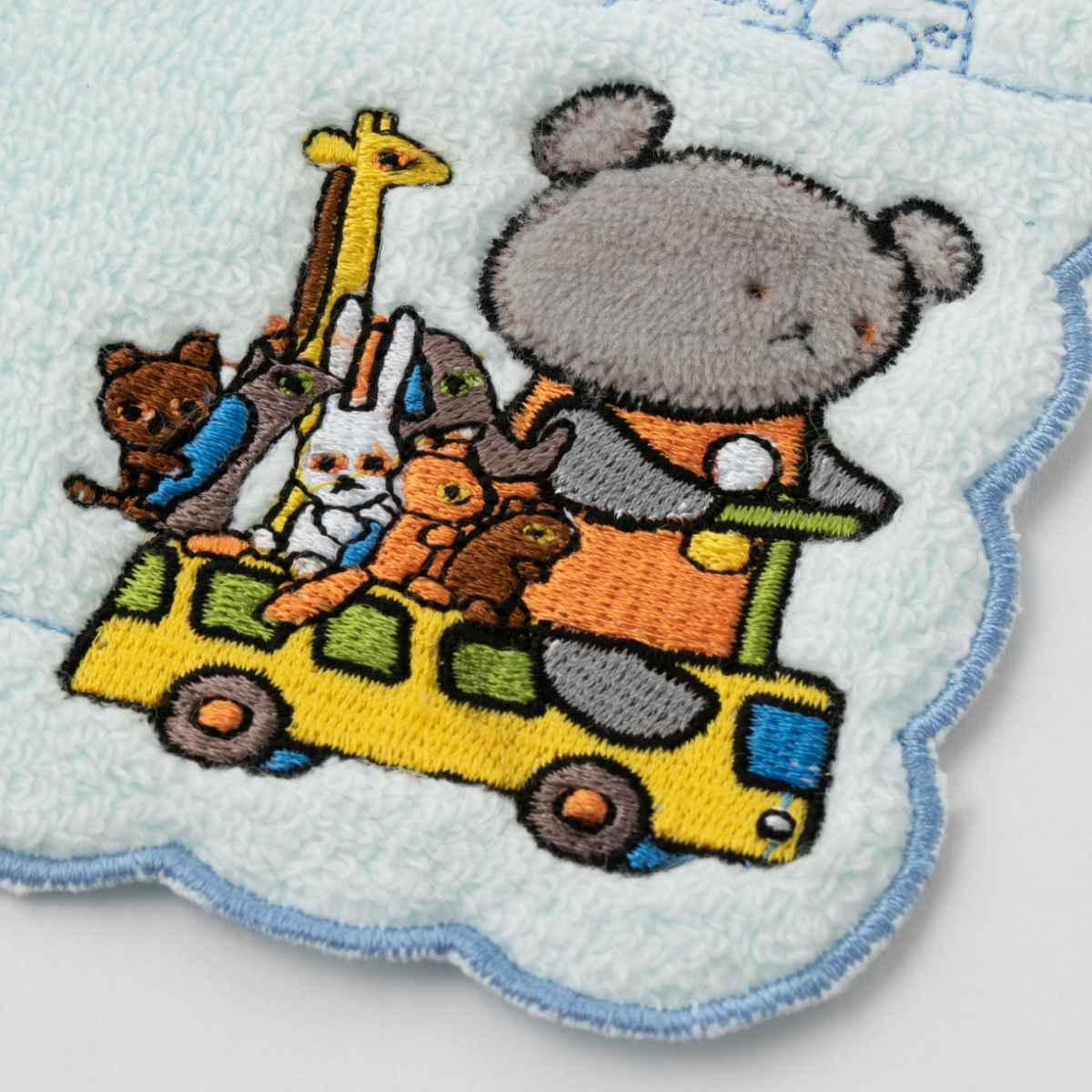 絵本からそのまま出てきたような、可愛いこぐまちゃんがデザインされたミニタオルです。フチの丸いカタチとキャラクターの刺繍がポイントです。